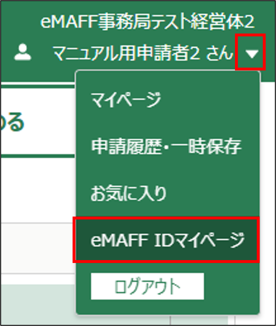 1.画面右上の「▼」ボタンをクリックし、表示された一覧から「eMAFF IDマイページ」をクリックします。