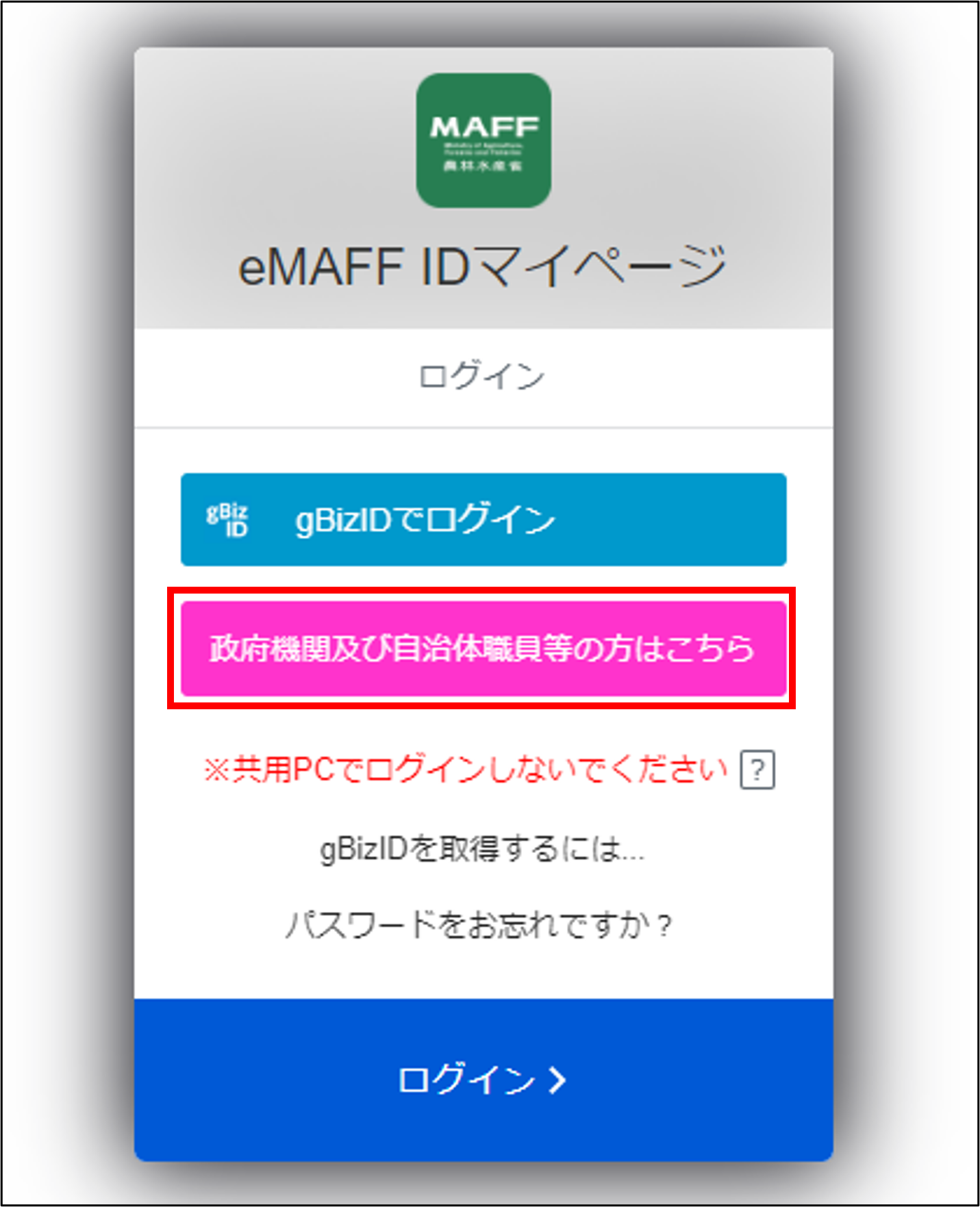 ※旧eMAFF IDでログインした場合は、以下のログイン画面が表示されます。「政府機関及び自治体職員等の方はこちら」をクリックし、ログインを行ってください。