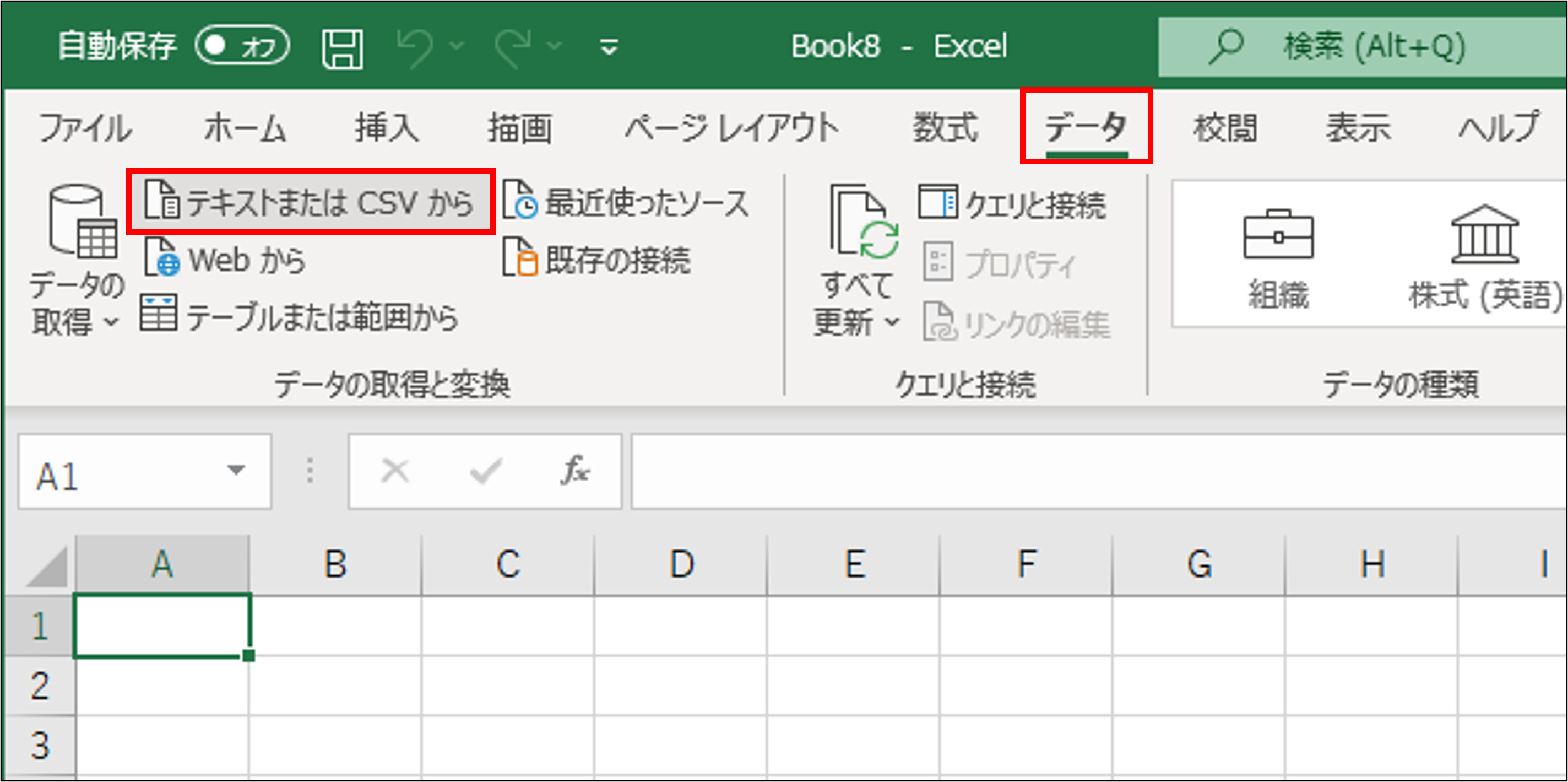 1.Excelを開いて、「データ」タブの「データの取得と変換」グループにある「テキストまたはCSVから」をクリックします。
