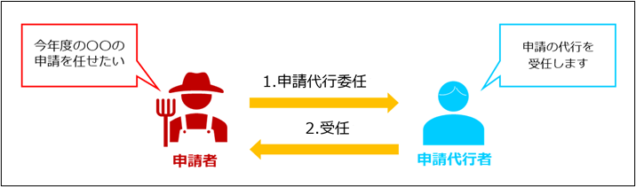まず申請者にて任意の申請代行者へ申請代行依頼を発信(委任)します。次に申請代行者は受け取った通知を「承諾」し、受任します。