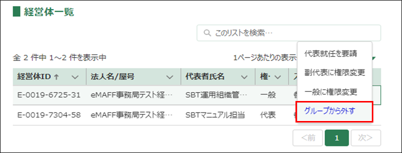 「経営体一覧」に表示されている経営体のうち、グループから外したい経営体の「▼」ボタンをクリックし、「グループから外す」を選択します.