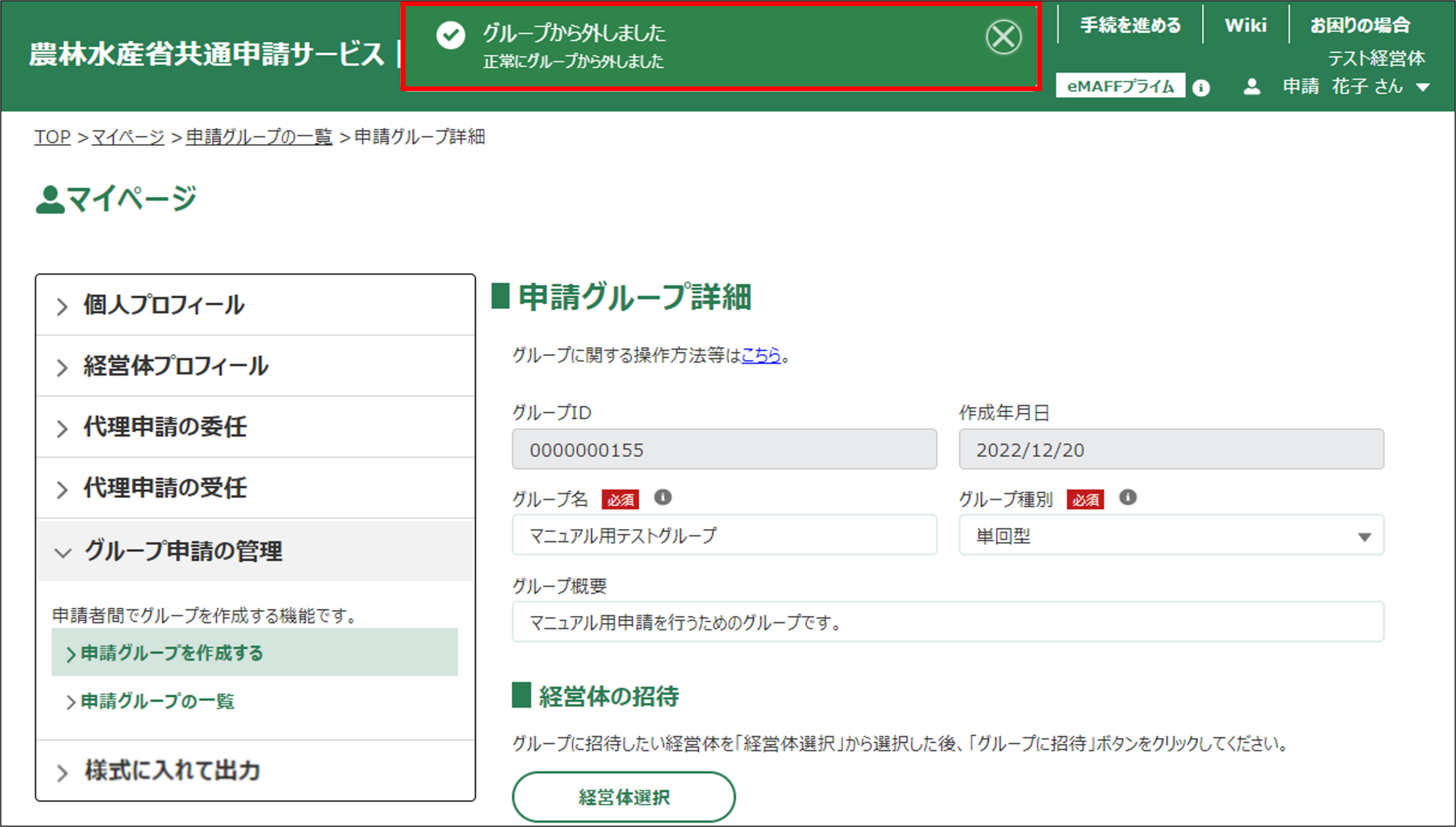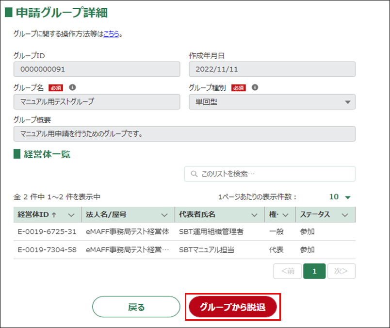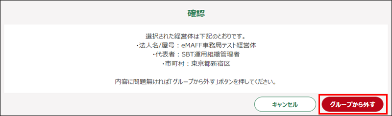グループの代表経営体及び副代表経営体は、グループに参加している経営体を外すことができます。