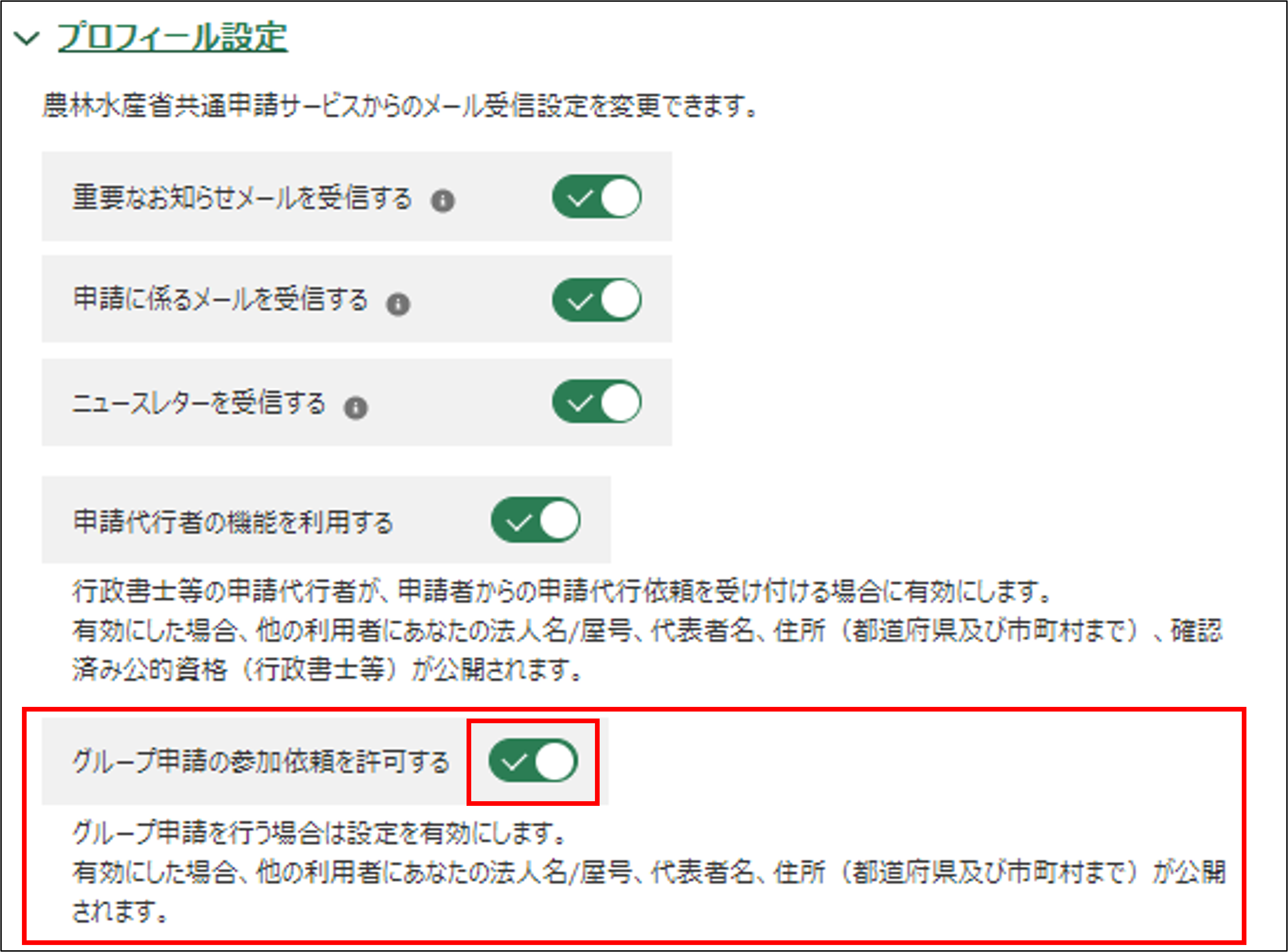 グループ申請の機能を有効化する場合は、「経営体プロフィール詳細」画面にて「プロフィール設定」の「グループ申請の参加依頼を許可する」のチェックを以下のように有効(緑色)に変更してください。