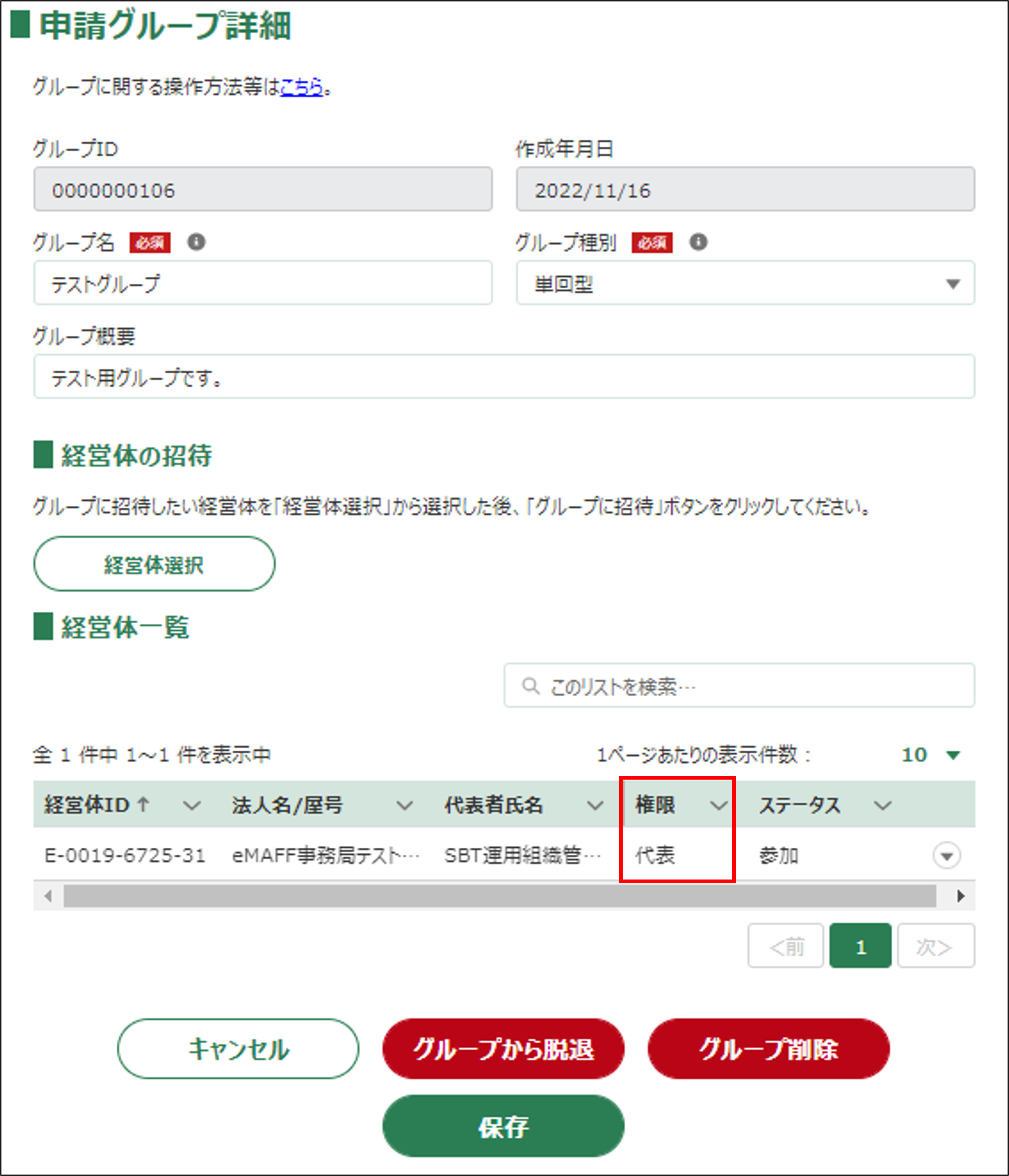 最初にグループを作成したアカウントの経営体は、グループの「代表」となります。