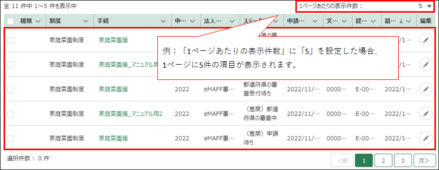 1.「1ページあたりの表示件数」の「▼」をクリックし、一覧から表示したい件数をクリックします。