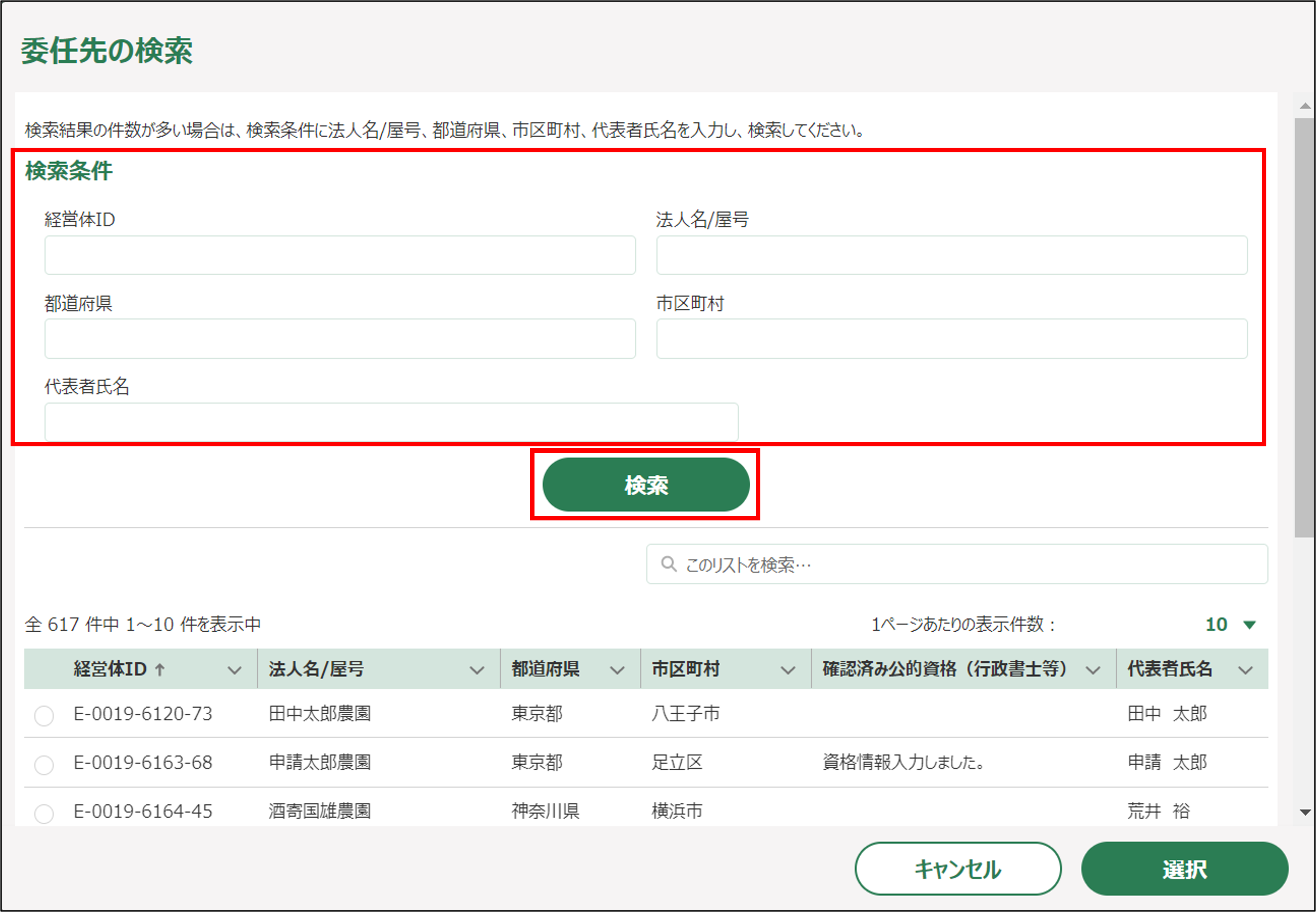 4.「委任先の検索」画面が表示されます。検索条件に申請代行者の経営体情報を入力し、「検索」ボタンをクリックします。