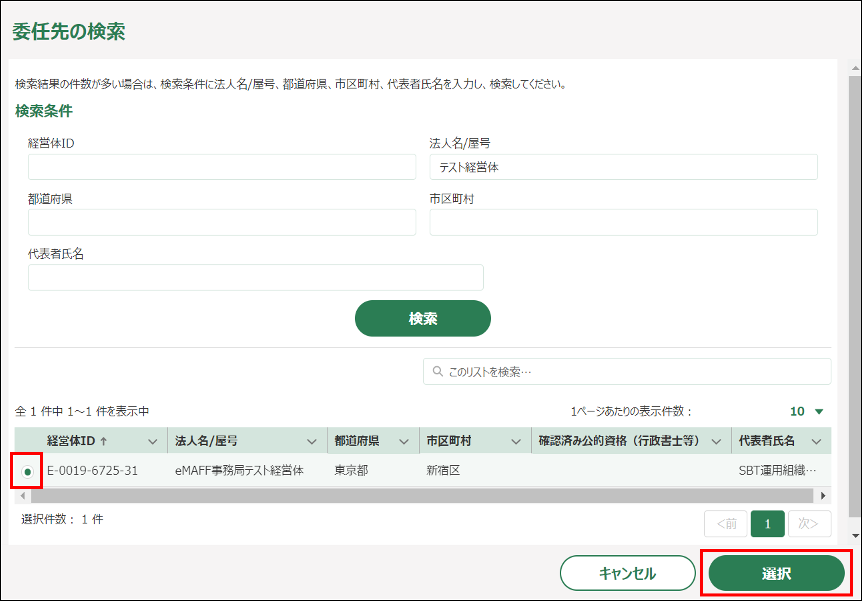 5.検索結果が一覧に表示されます。画面左端の「〇」をクリックし、「選択」ボタンをクリックします。