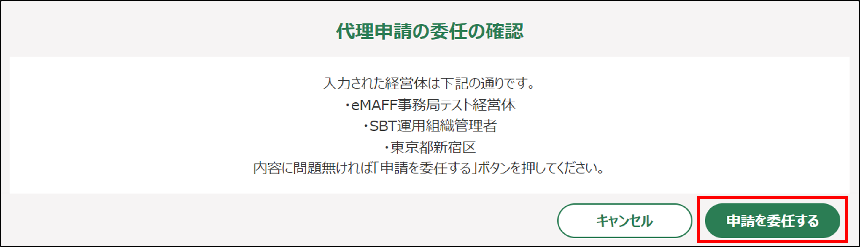 11.「代理申請の委任の確認」画面が表示されます。申請代行者の経営体情報を確認し、「申請を委任する」ボタンをクリックします。