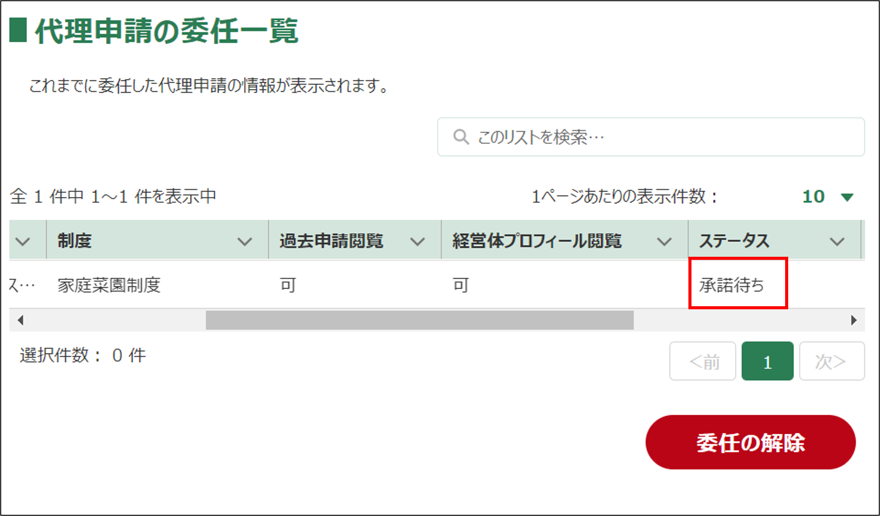 14.「代理申請の委任一覧」に委任した経営体が表示されます。ステータスは「承諾待ち」となります。