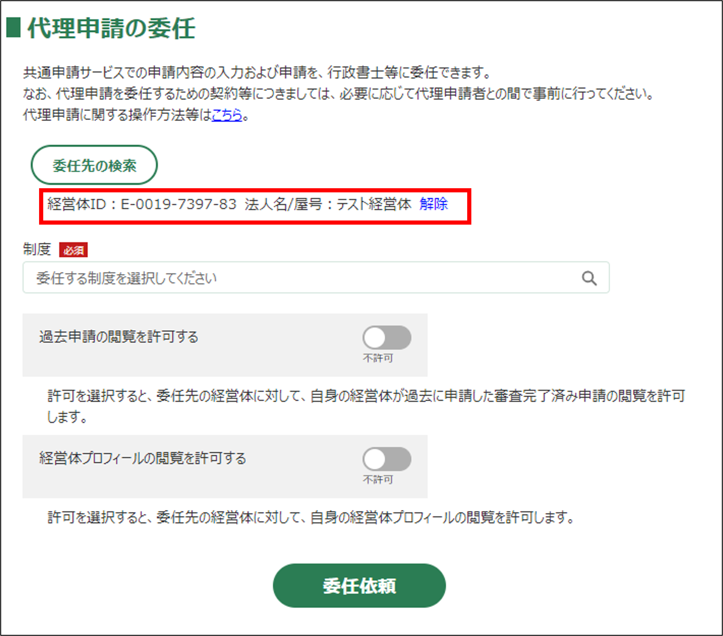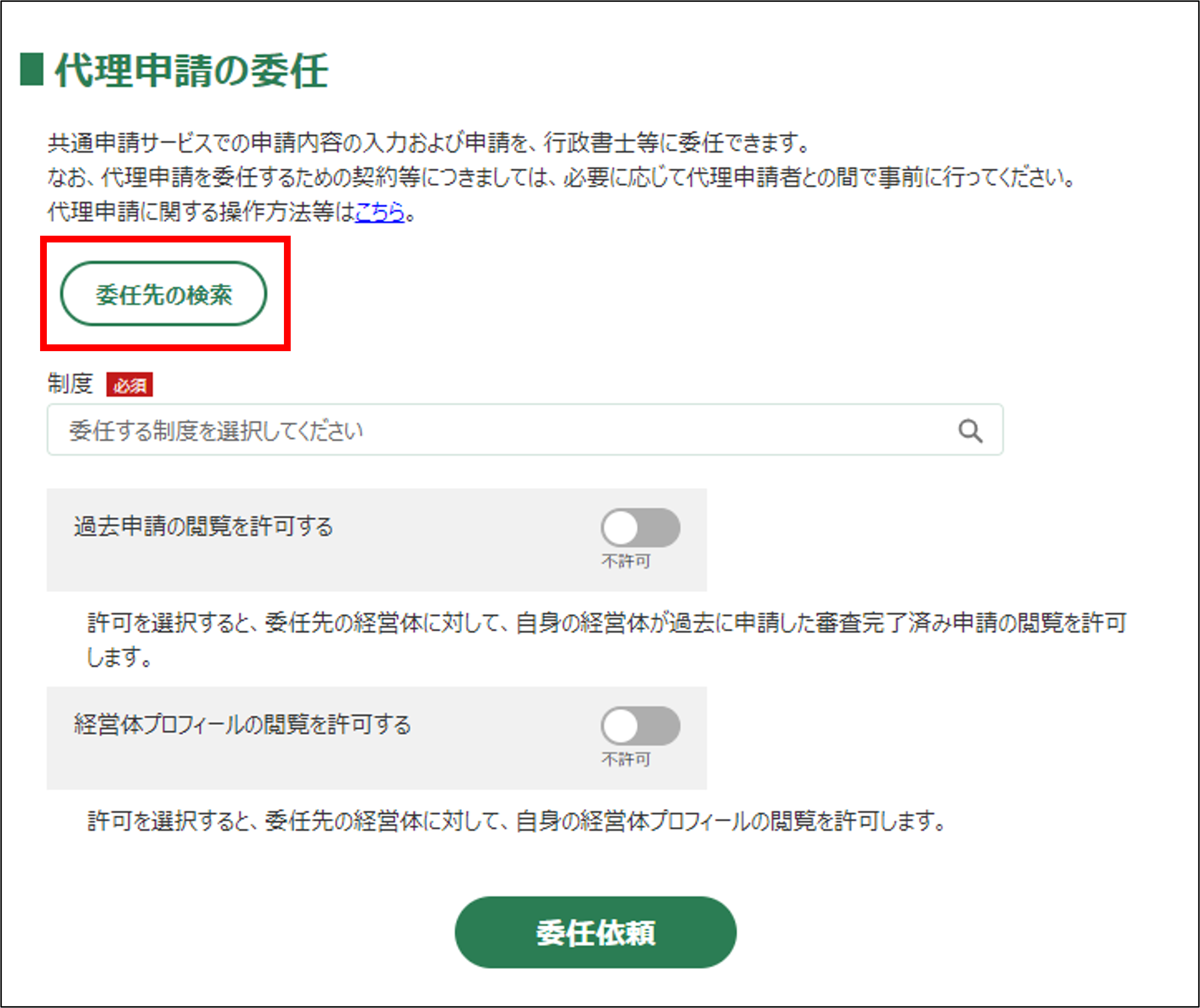 ※対象の申請代行者が検索にヒットしない場合、「申請代行者の機能」を有効にするよう申請代行者に連絡してください。