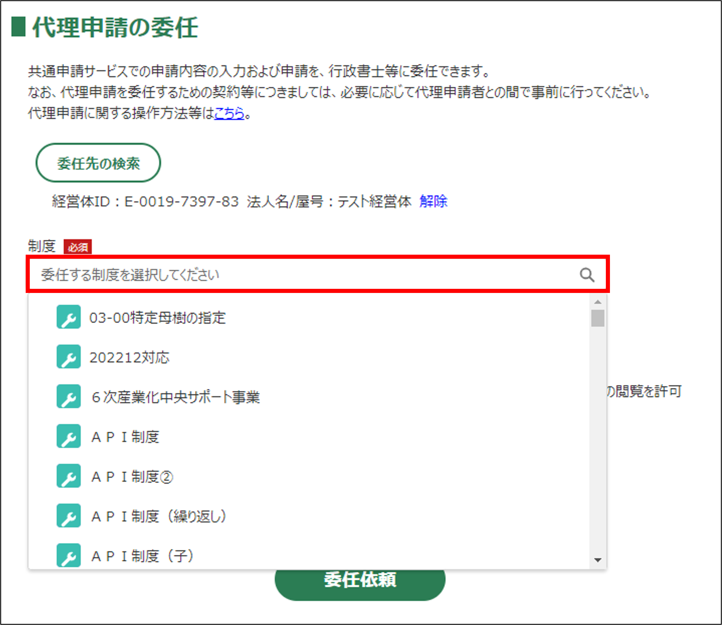 7.「制度」の入力欄をクリックし、申請代行者に申請を依頼する制度をクリックします。