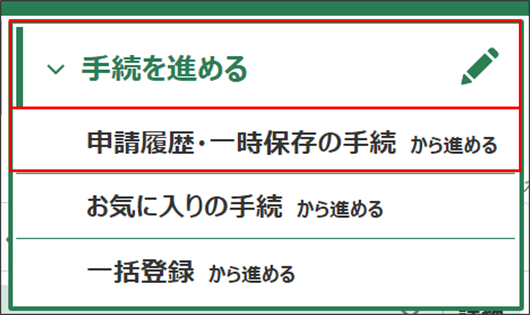 2.「申請履歴・一時保存の手続から進める」画面が表示されます。