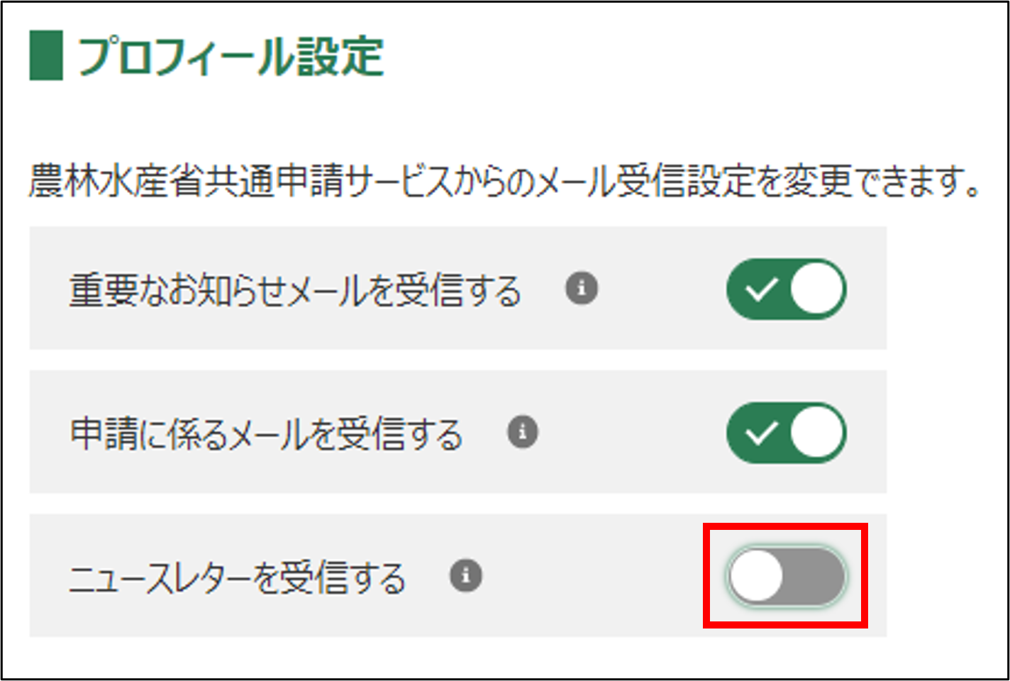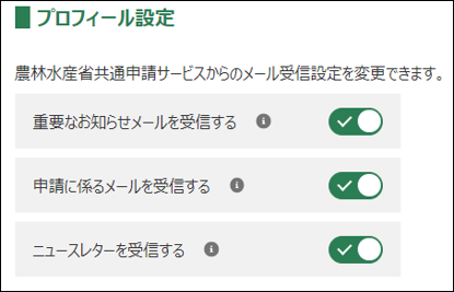 共通申請サービスからのお知らせ情報のメール(農林水産省における新たな政策や役立つ情報のメール配信を検討中)を受信する場合は有効にします。 |