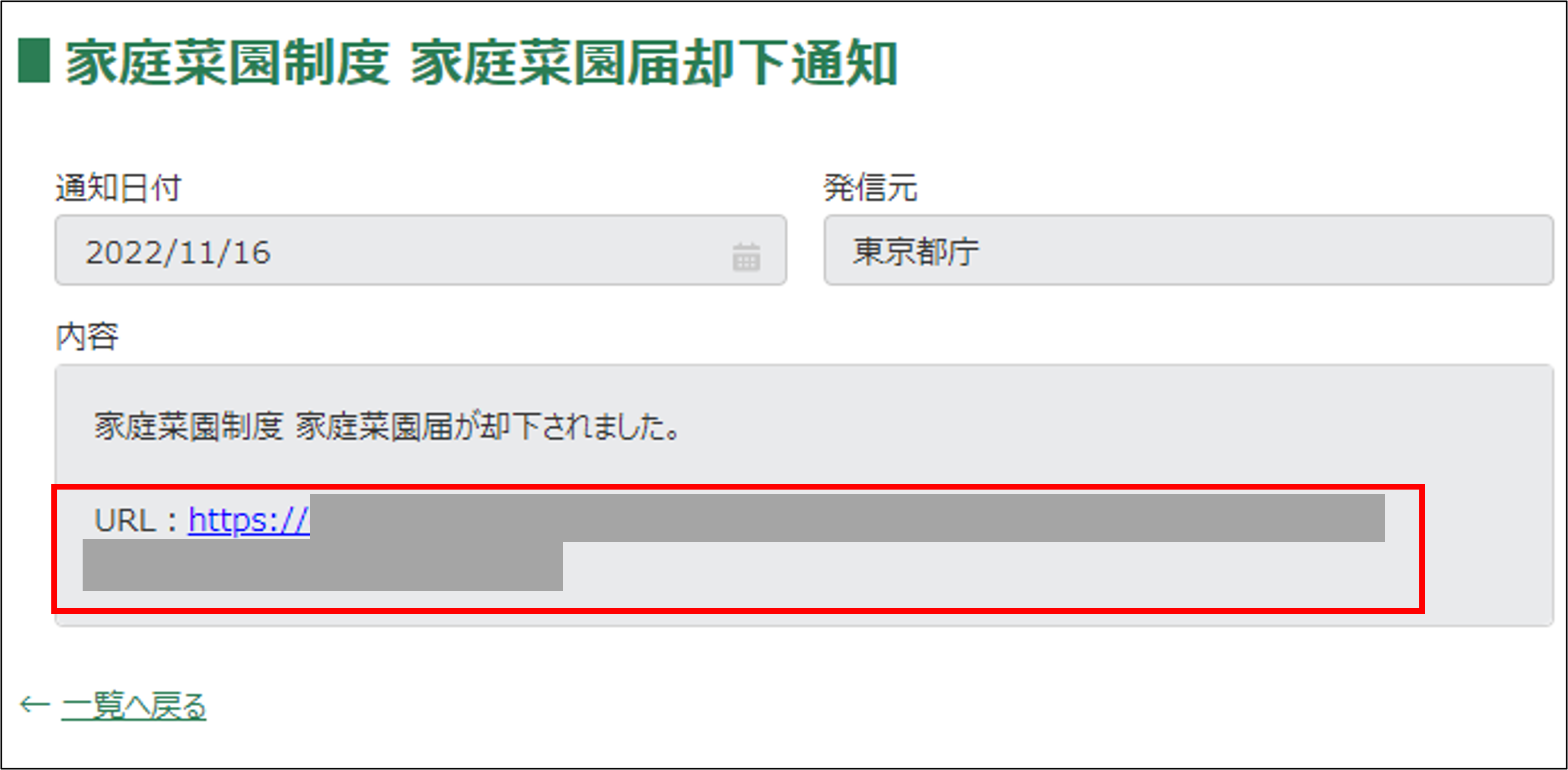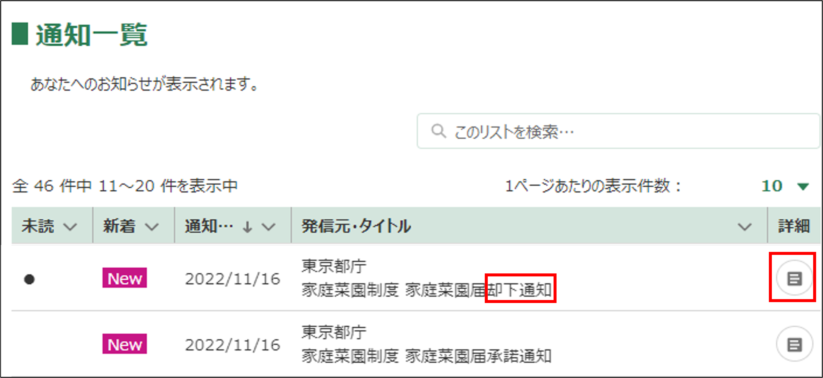 通知一覧から「却下通知」の「」ボタンをクリックします。
