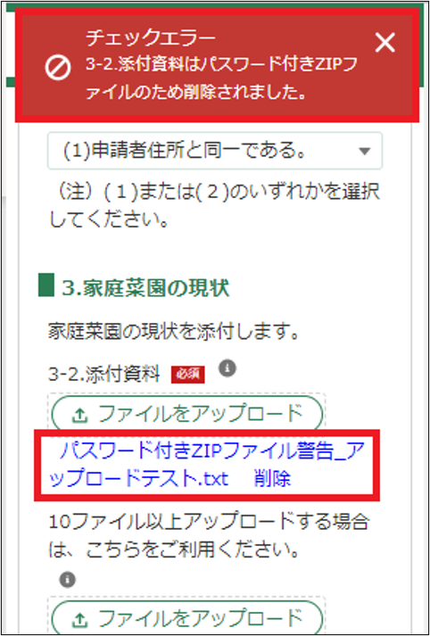 パスワード付きzipファイルについて パスワード付きzipファイルをアップロードした場合、画面上部にエラーが表示されます。 また、アップロードしたzipファイルは破棄され、「パスワード付きZIPファイル警告_〇〇.txt」が生成されます(〇〇にはアップロードしたファイル名が入ります)。 パスワードが付いていないzipファイルを再度アップロードしてください。 ※「パスワード付きZIPファイル警告_〇〇.txt」の文字列をタップするとダウンロードされ、エラーの理由を確認できます。 ※生成された「パスワード付きZIPファイル警告_〇〇.txt」は申請提出前に削除してください。