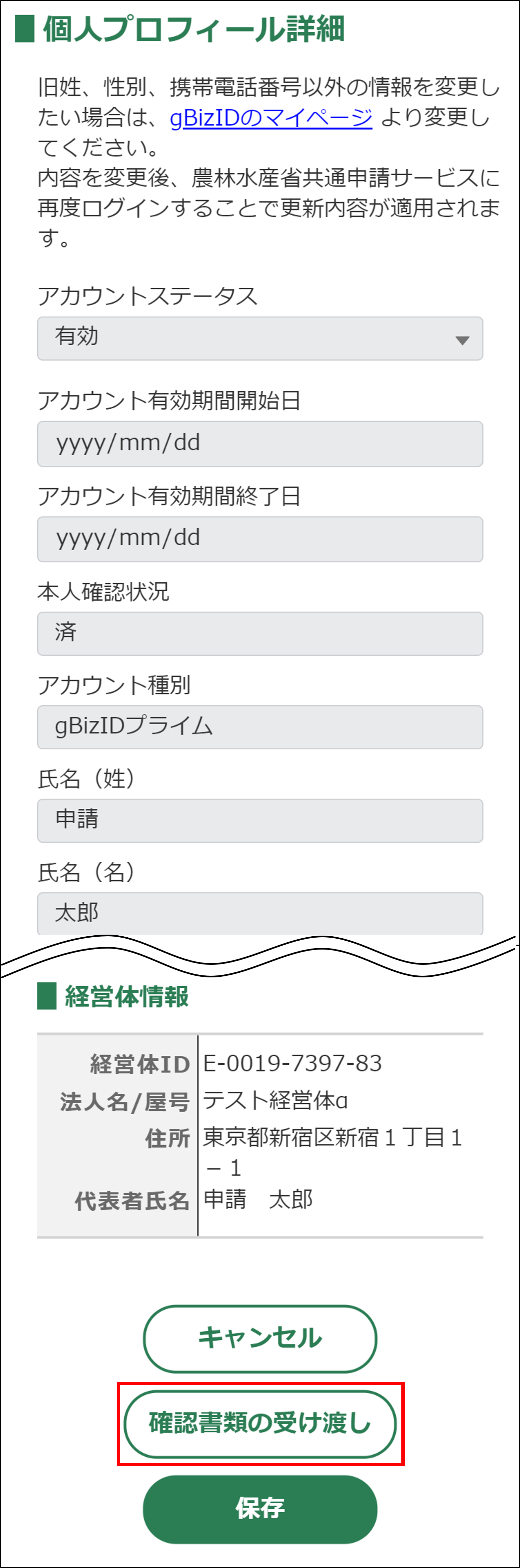 経営体プロフィール詳細画面で、背景が灰色の入力済み項目を更新すると、事前に行った本人確認時の情報と異なってしまうため、再度本人確認を行う必要があります。
