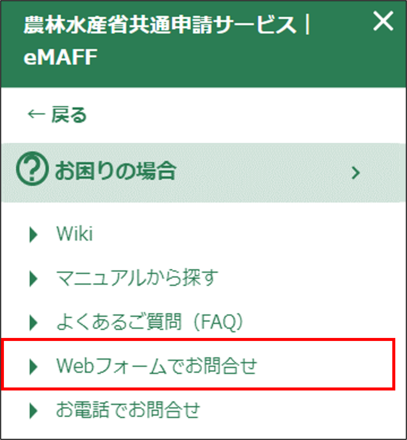 画面左部のメニューから「お困りの場合」をタップし、表示された一覧から「Webフォームでお問合せ」をタップします。