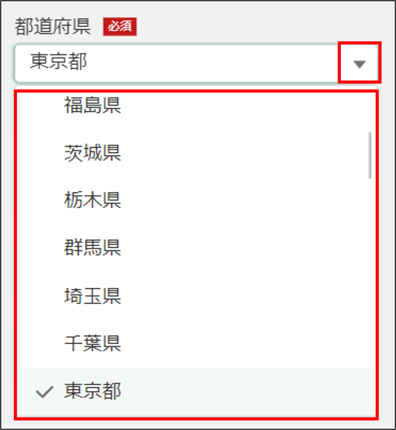 6.「都道府県」を確認します。変更する場合は「▼」ボタンをタップし、表示された一覧から該当する都道府県を選択します。