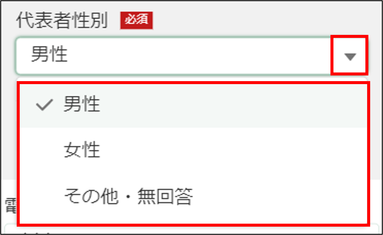 9.「代表者性別」を確認します。変更する場合は「▼」ボタンをタップし、表示された一覧から該当する性別を選択します。