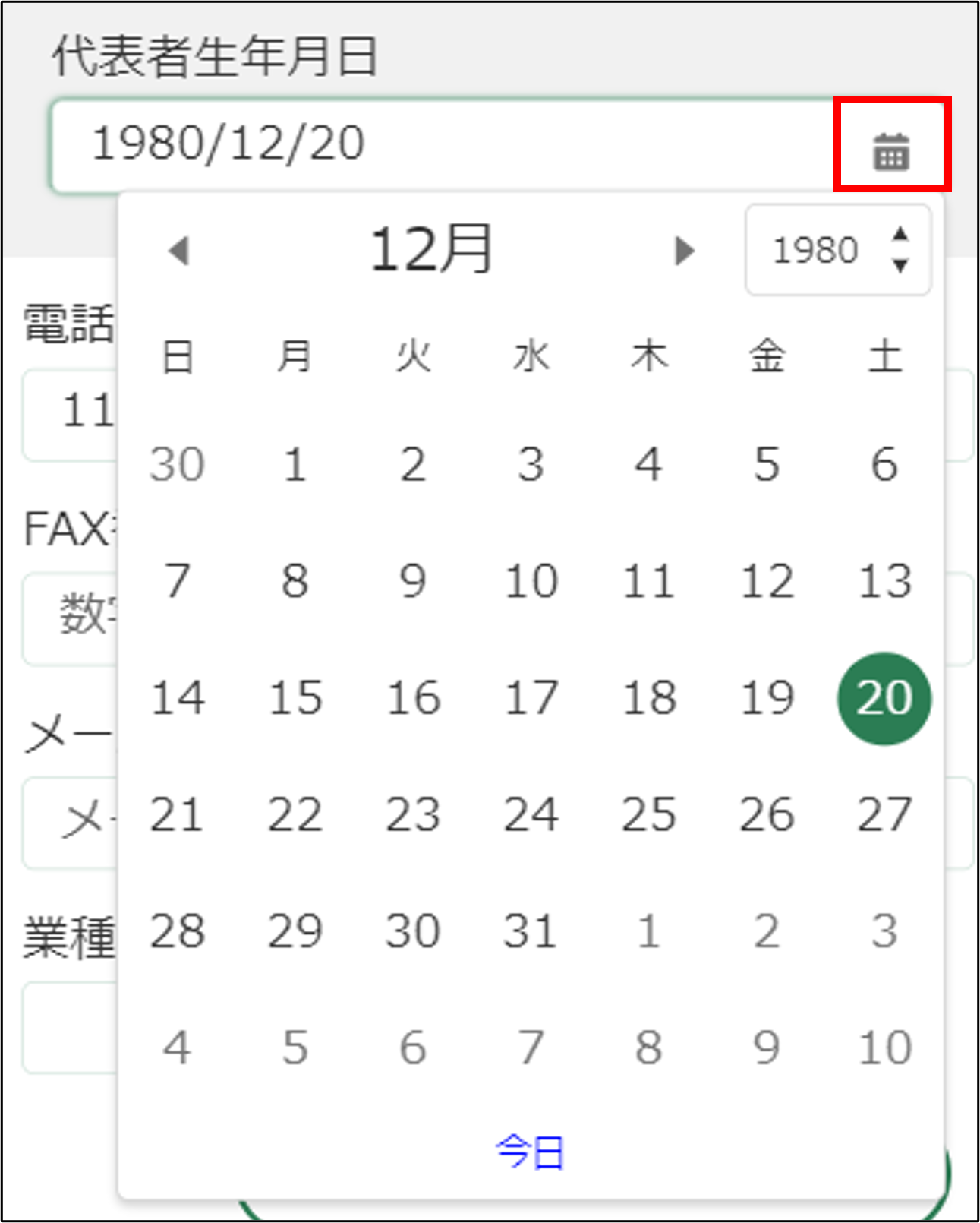 10.「代表者生年月日」を確認します。変更する場合は「」ボタンをタップし、表示されたカレンダーから該当する日付を選択します。