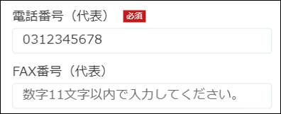 11.「電話番号(代表)」「FAX番号(代表)」を確認します。変更する場合はハイフンを含めずに、半角11桁以内で入力します。(例:0312345678)