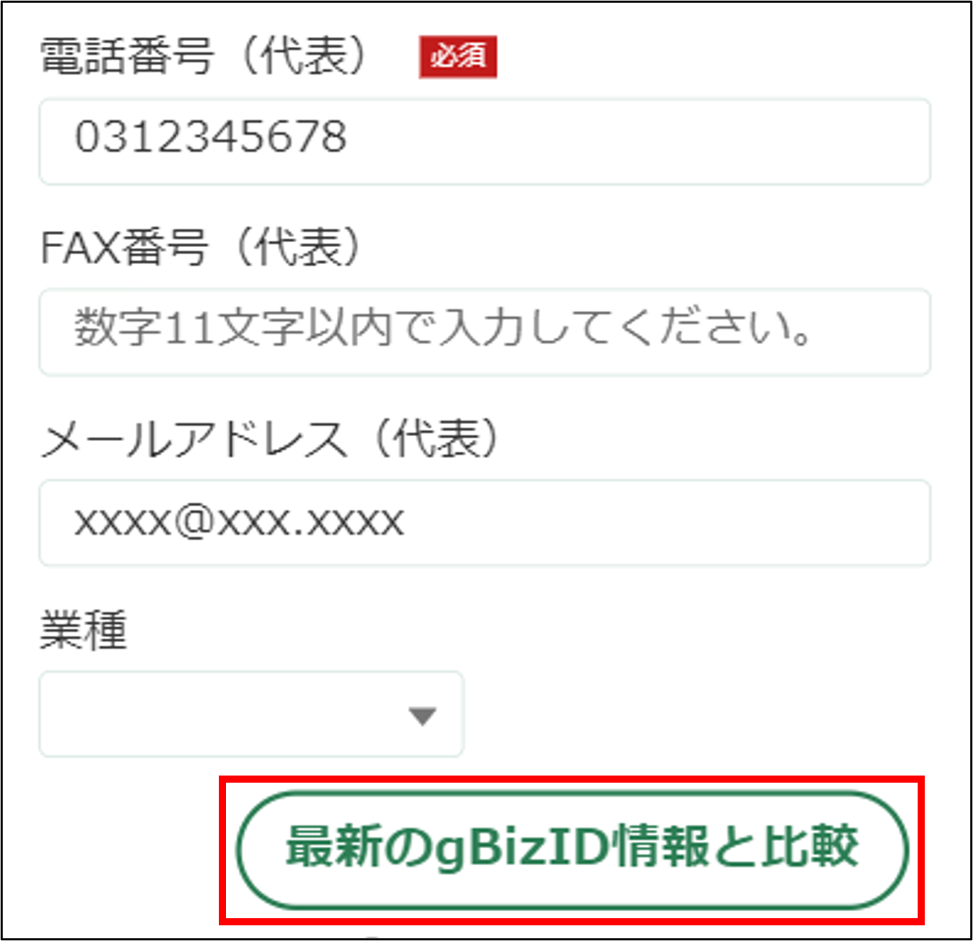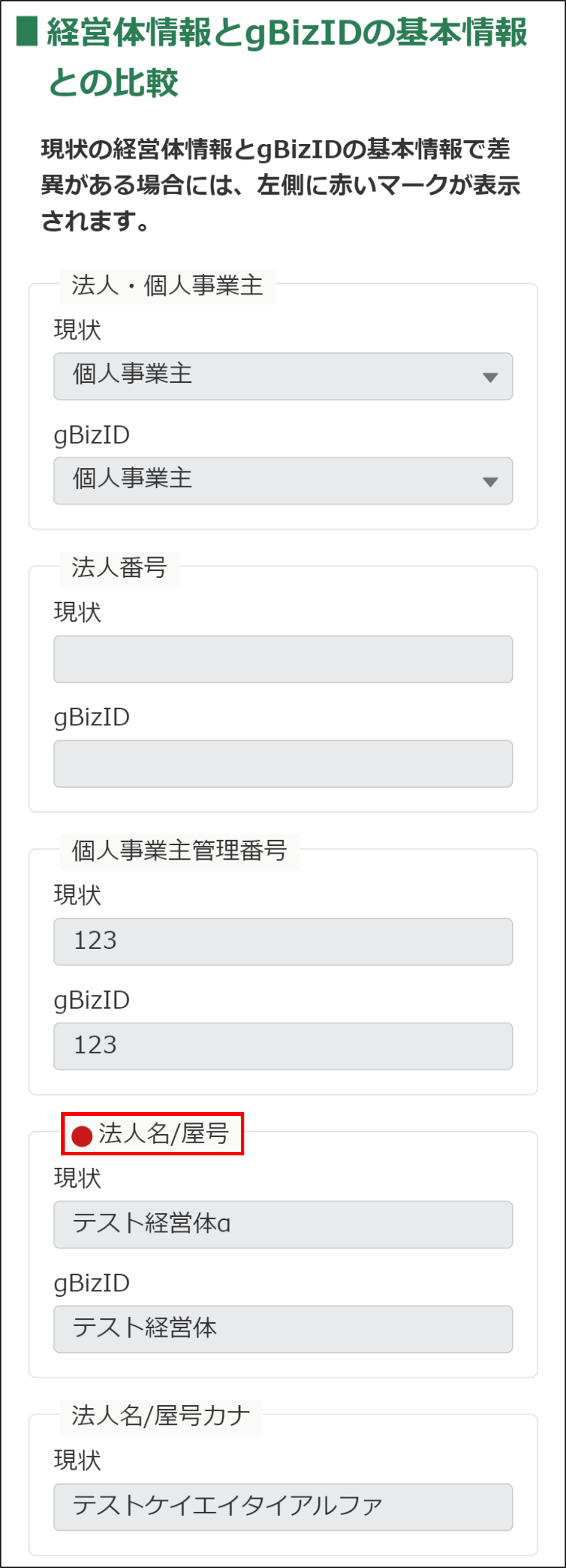 3.最新のgBizID情報と比較できます。現状とgBizIDで登録内容に差異がある場合は、差異がある項目の左側に赤いマークが表示されます。