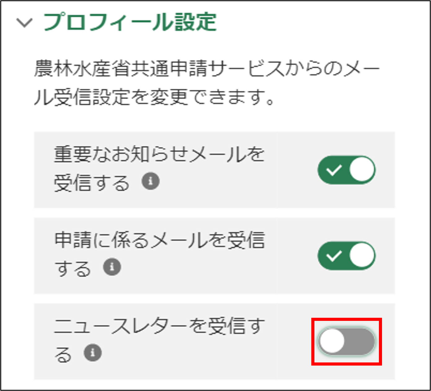 | ニュースレターを受信する | 共通申請サービスからのお知らせ情報のメール(農林水産省における新たな政策や役立つ情報のメール配信を検討中)を受信する場合は有効にします。 |