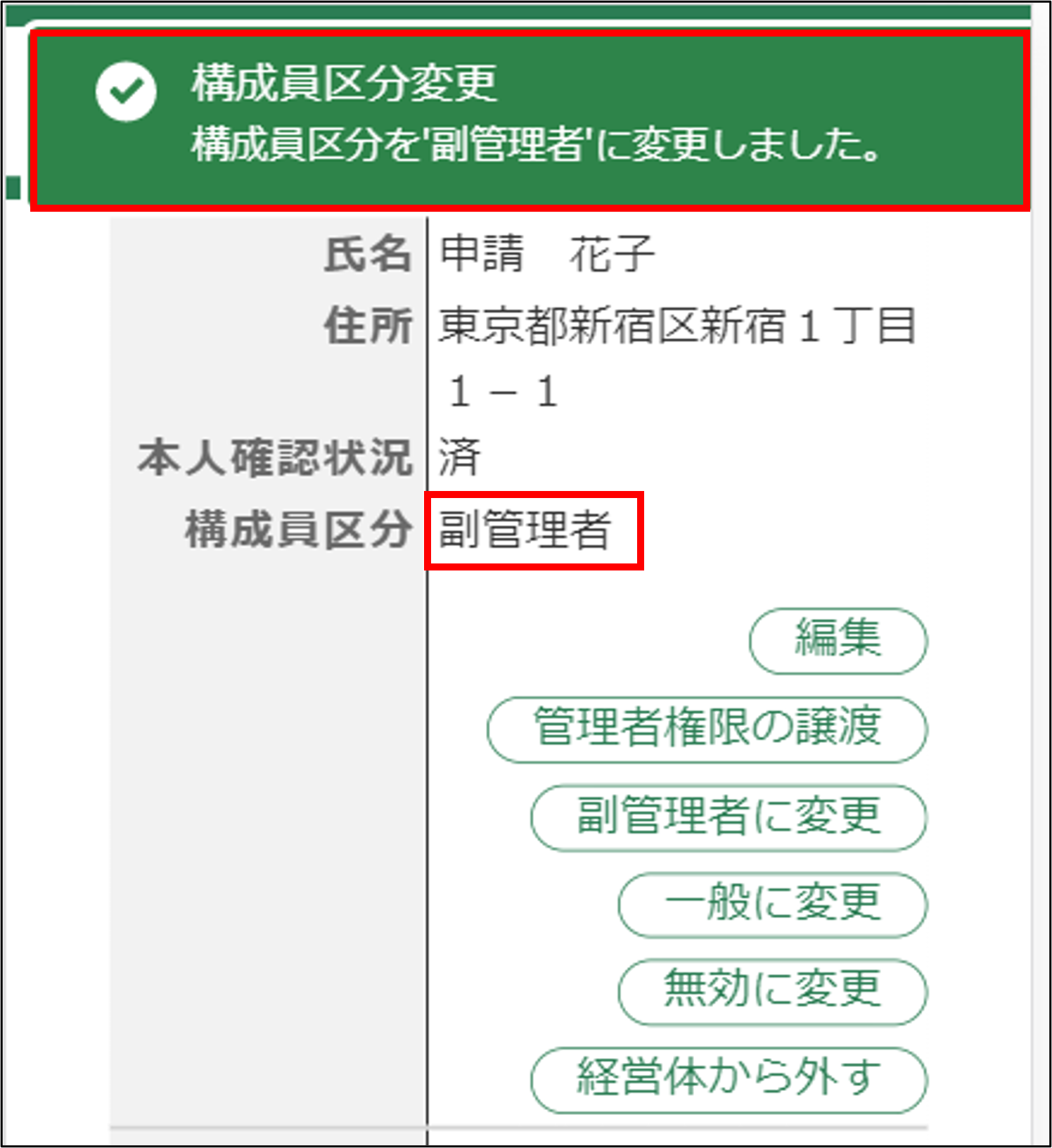 4.画面上部に「構成員区分を'副管理者'に変更しました。」と表示されます。変更後の構成員区分が表示されます。