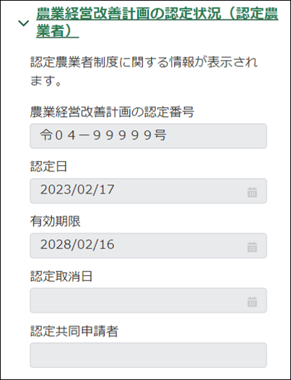 認定農業者制度の申請を提出したことがある場合、情報が表示されます。