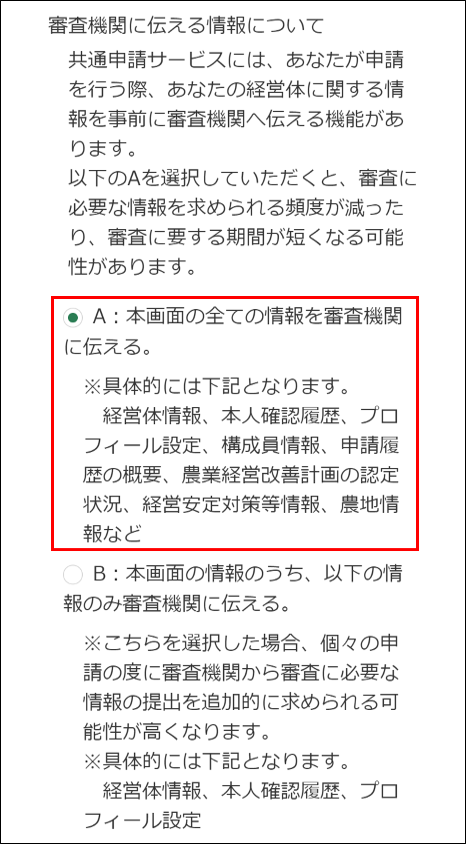 | A:本画面の全ての情報を審査機関に伝える。 |