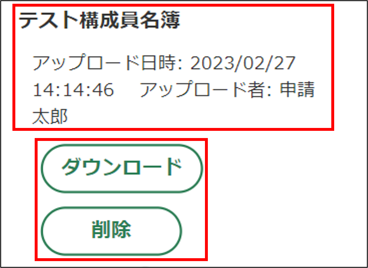 4.アップロード後、「ファイル名」「アップロード日時」「アップロード者」が表示されます。アップロードされたファイルのダウンロード、削除が可能となります。
