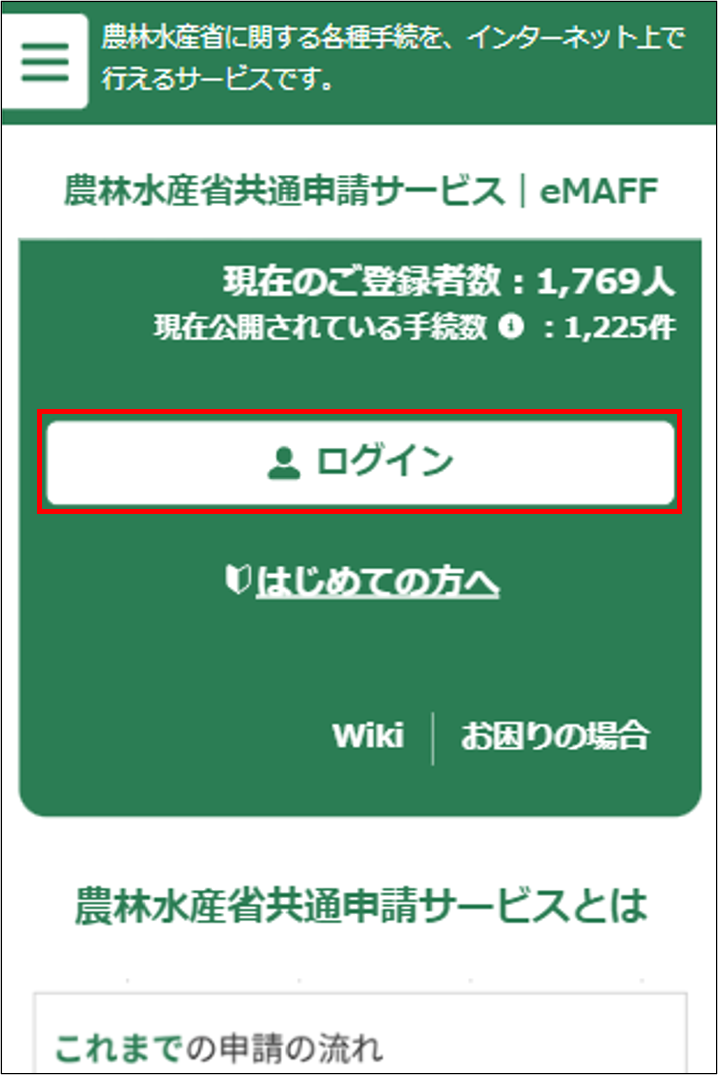 1.以下のURLにアクセスすると、共通申請サービス(申請者用)のログイン前画面が表示されます。