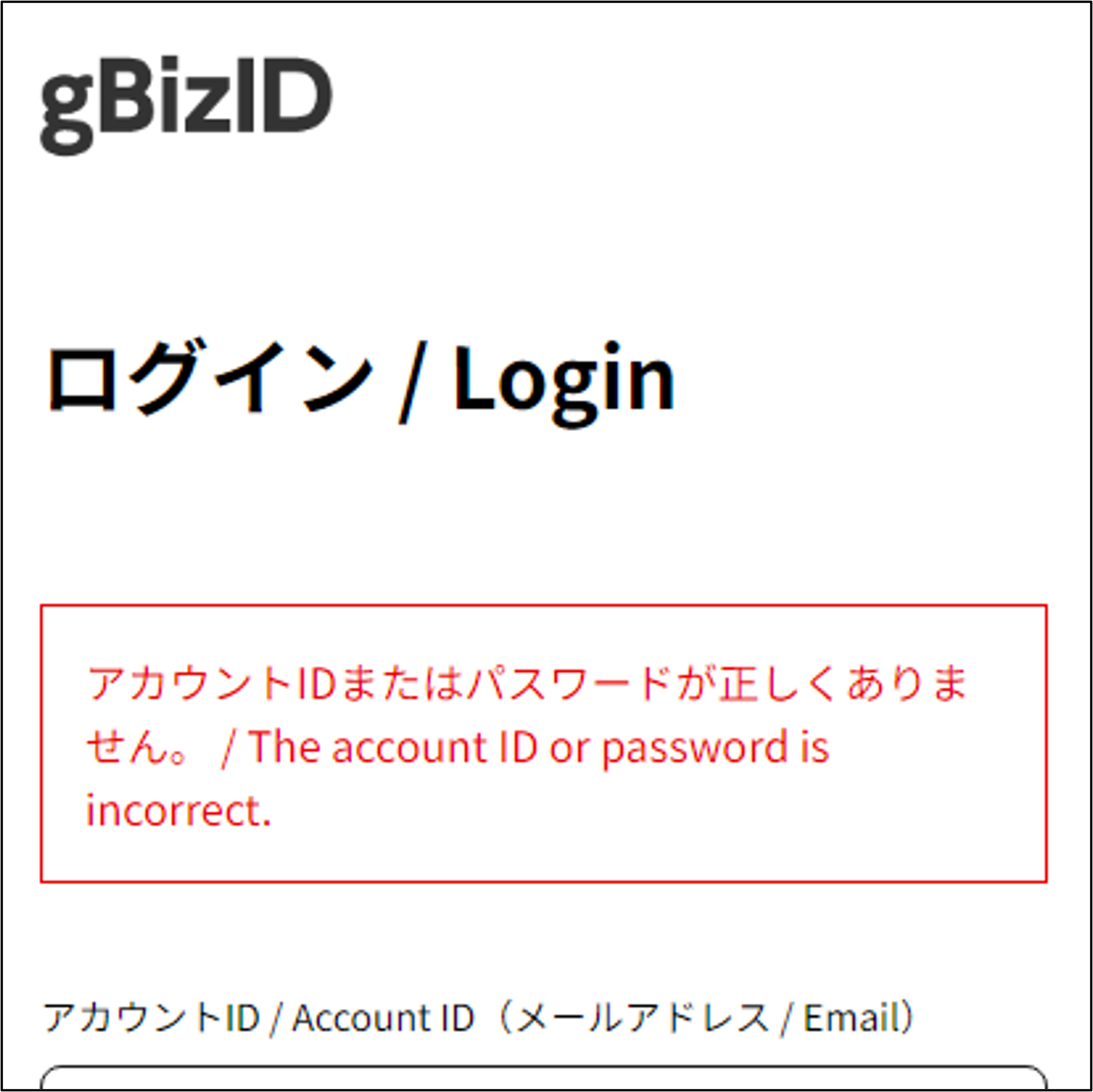 ※「アカウントID」又は「パスワード」が間違っている場合は、「アカウントIDまたはパスワードが正しくありません。」とメッセージが表示されます。正しい「アカウントID」又は「パスワード」を再度ご入力ください。