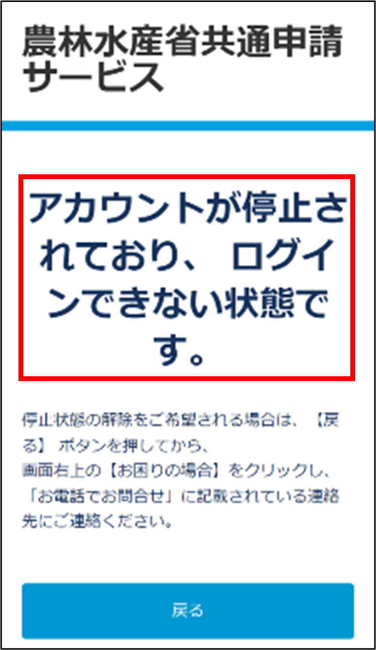アカウントが「停止」されている場合、以下の画面が表示されます。 コールセンターにお問合せください。