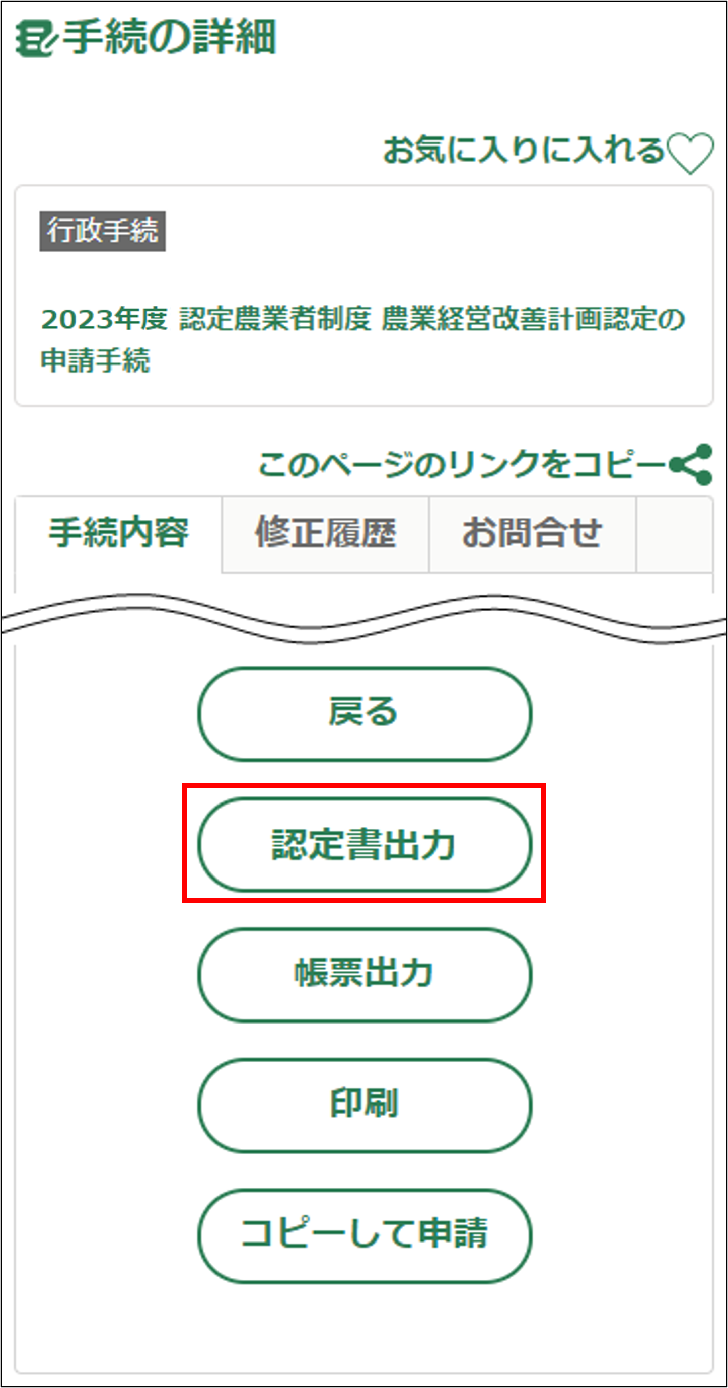 ※認定庁が、この機能で「農業経営改善計画認定書」を電子的に交付しない場合、「認定書出力」ボタンは押せない状態になっています。認定書の交付方法については、認定庁にご確認ください。