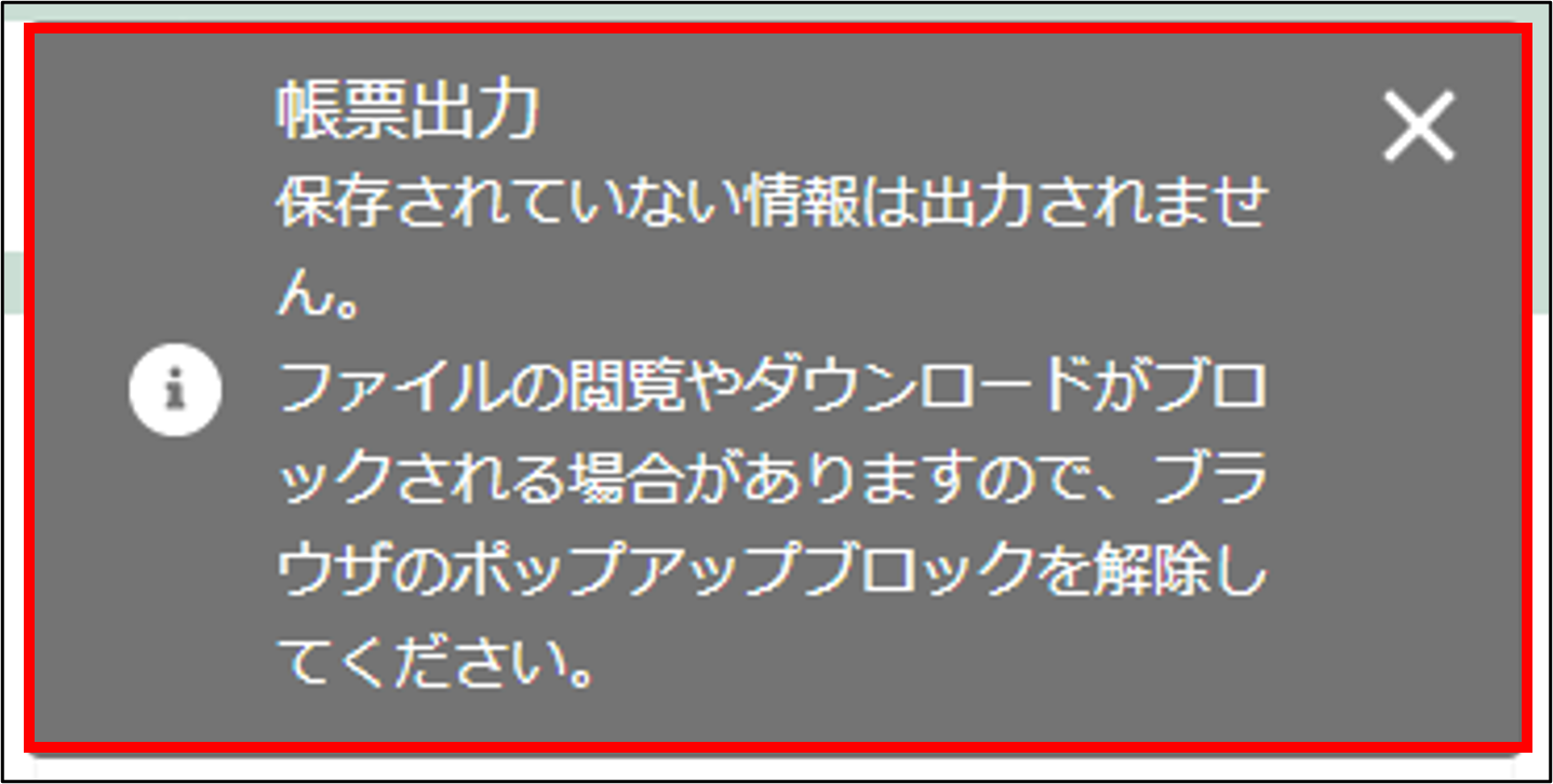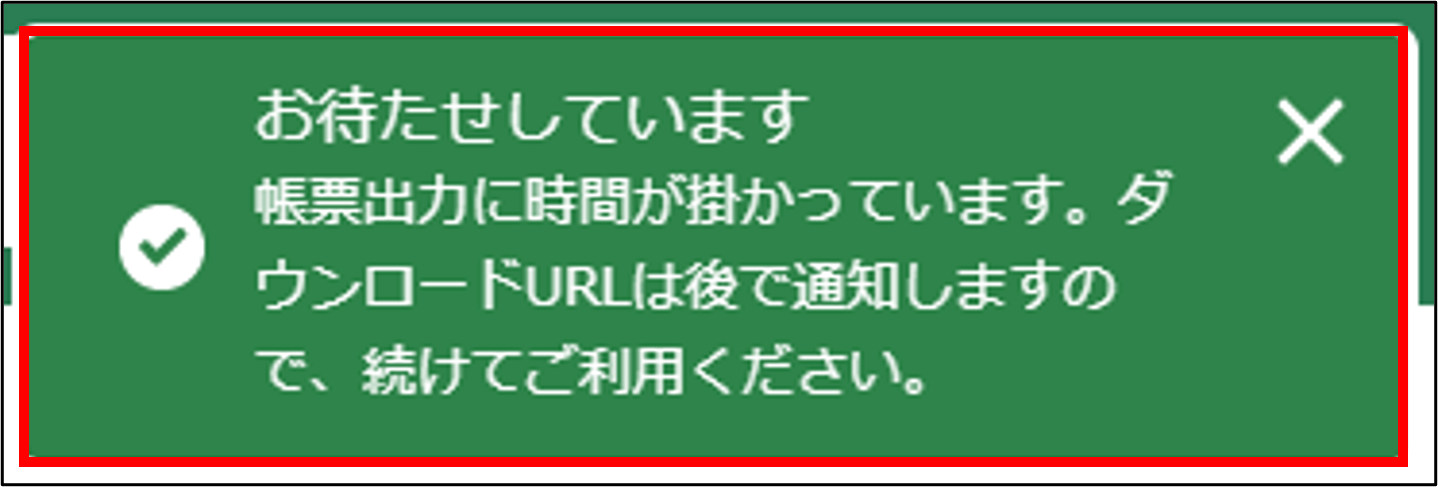 帳票データの作成処理に時間(30秒以上)がかかる場合、画面上部に、「帳票出力に時間が掛かっています。ダウンロードURLは後で通知しますので、続けてご利用ください。」と表示されます。