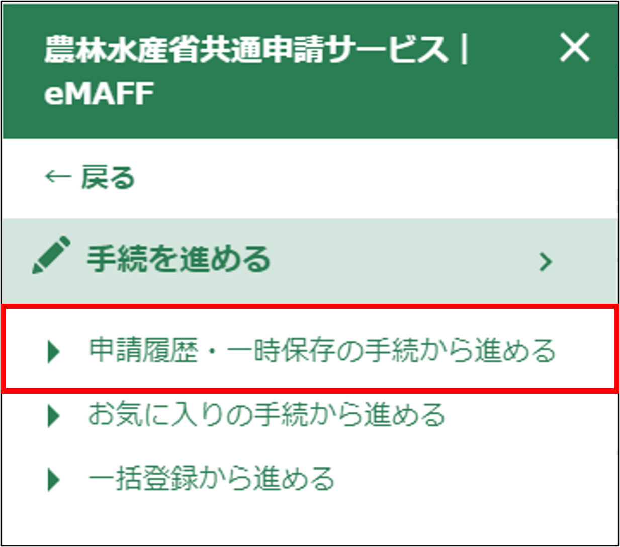 3.表示された一覧から「申請履歴・一時保存の手続から進める」をタップします。