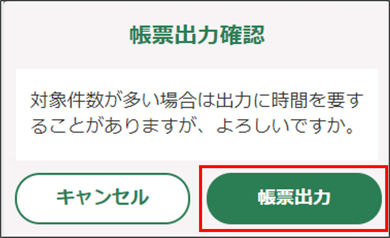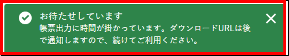 帳票データの作成処理に時間(30秒以上)がかかる場合、画面上部に、「帳票出力に時間が掛かっています。ダウンロードURLは後で通知しますので、続けてご利用ください。」と表示されます。
