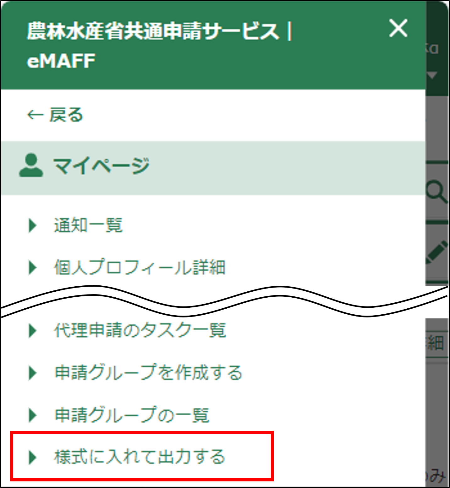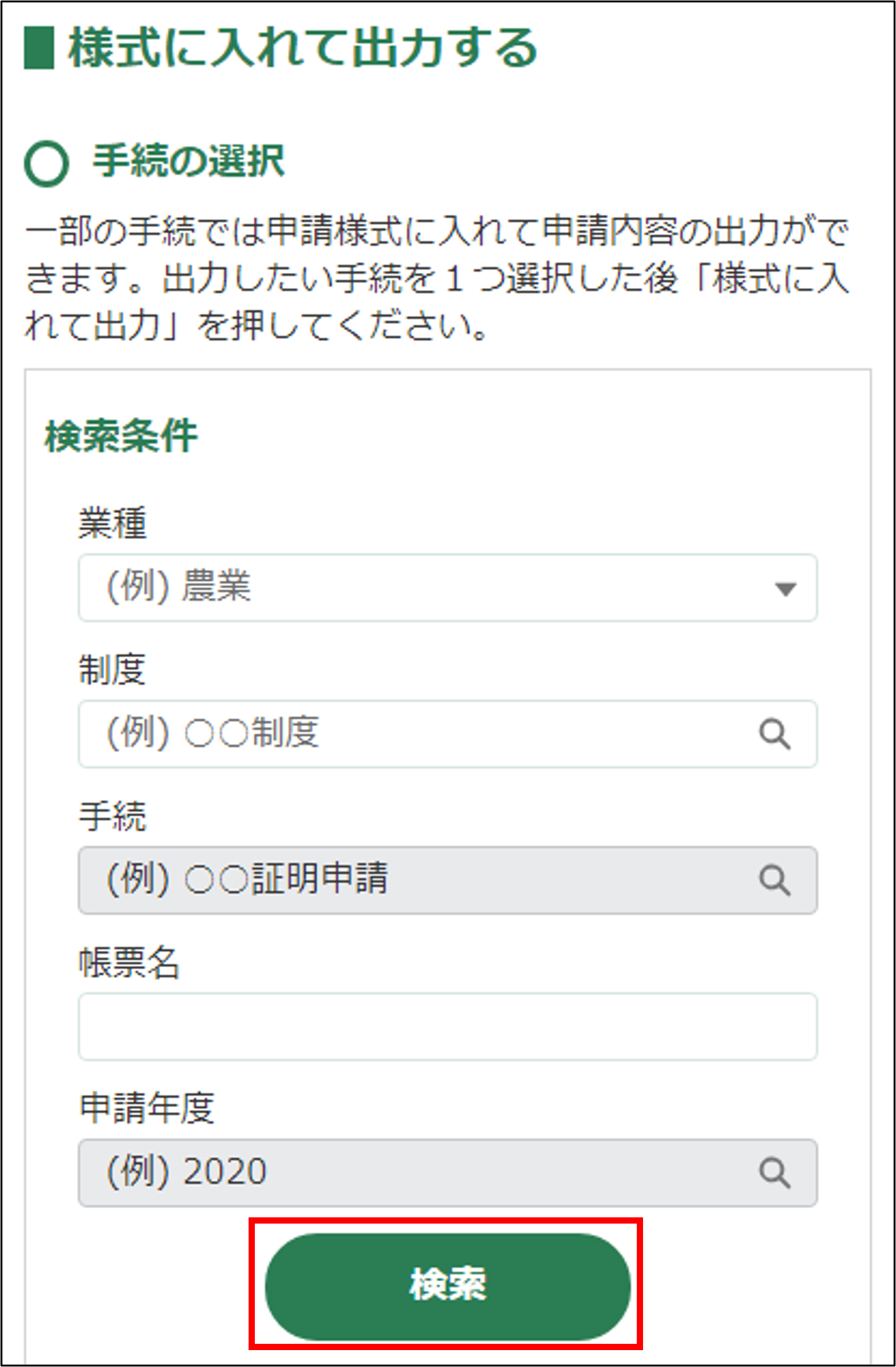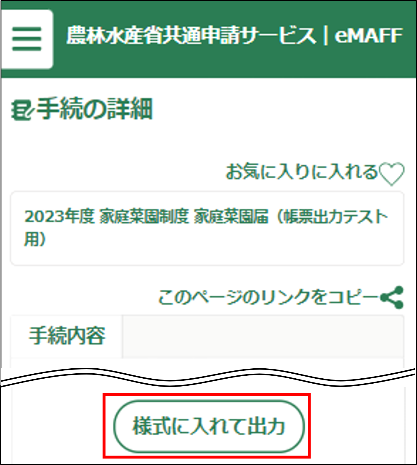※PDF出力ができない手続は「様式に入れて出力」ボタンが表示されません。