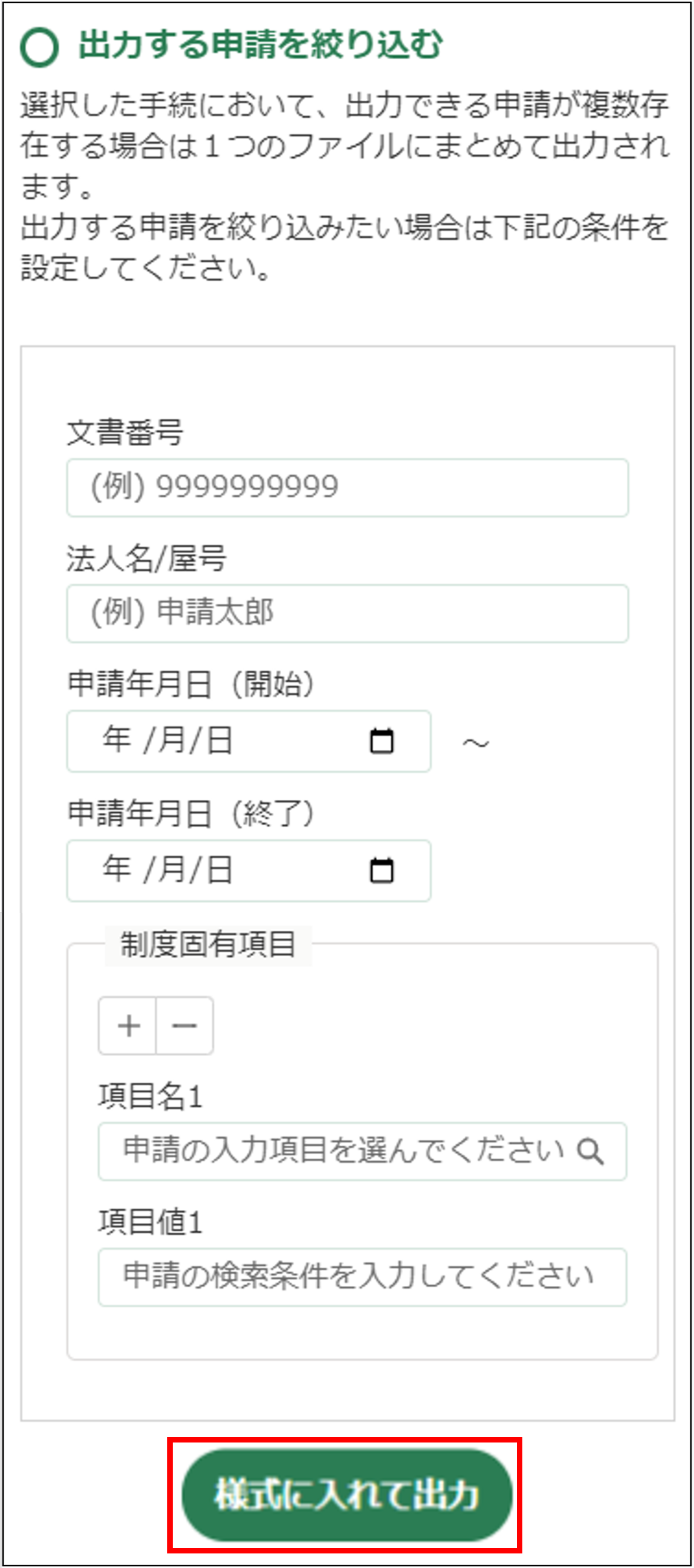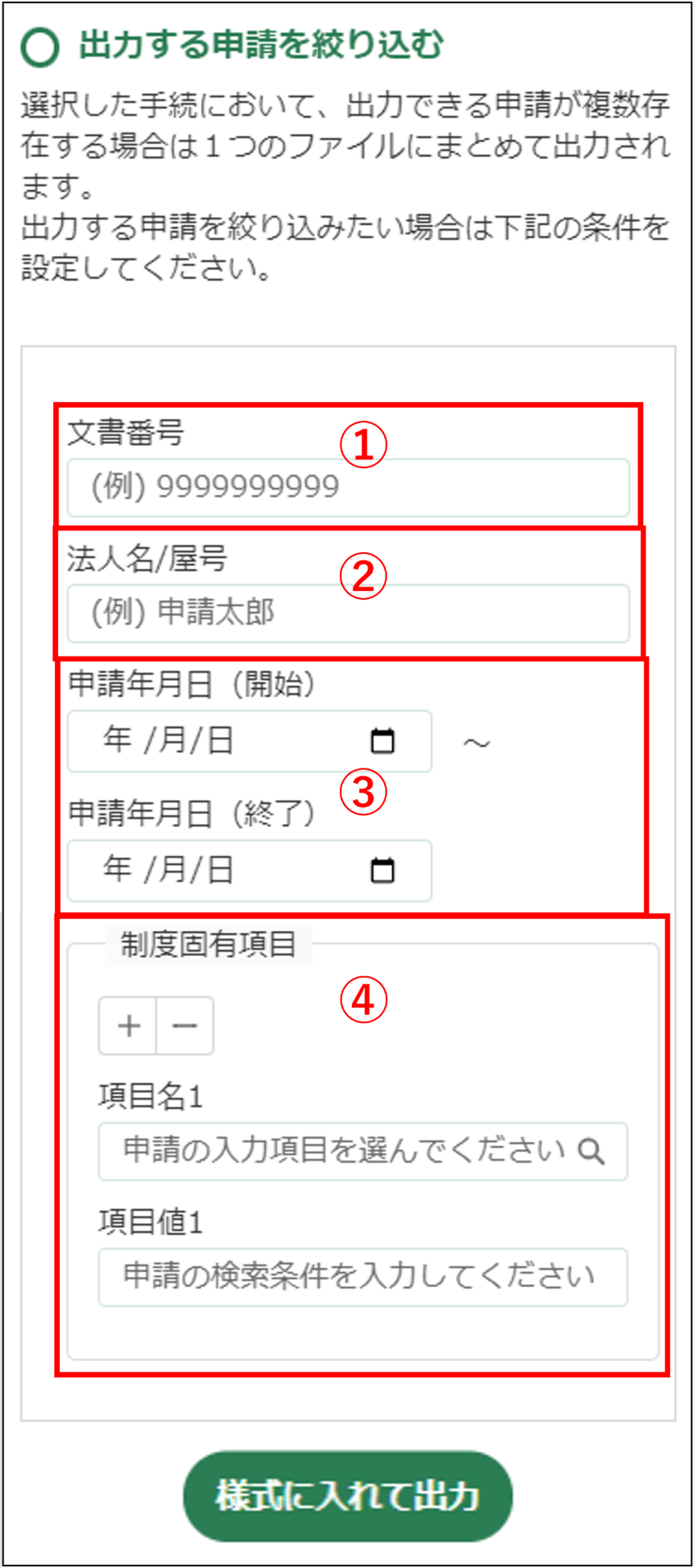 | ① | 文書番号 | 文書番号が一致する申請情報が帳票出力されます。 | |