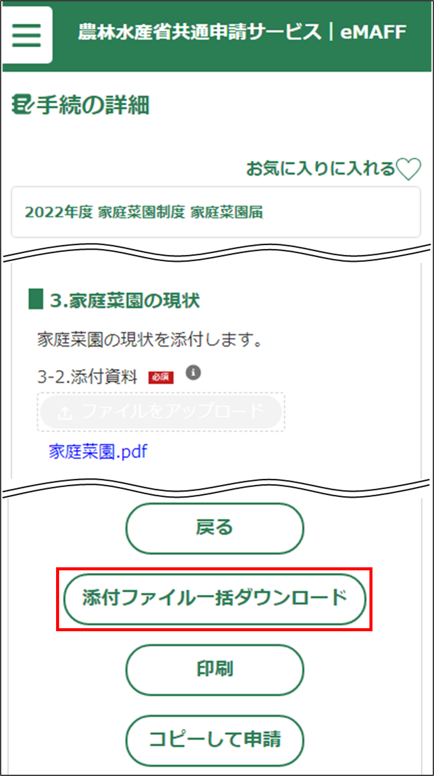 6.「手続の詳細」画面が表示されます。画面下部にある「添付ファイル一括ダウンロード」ボタンをタップします。