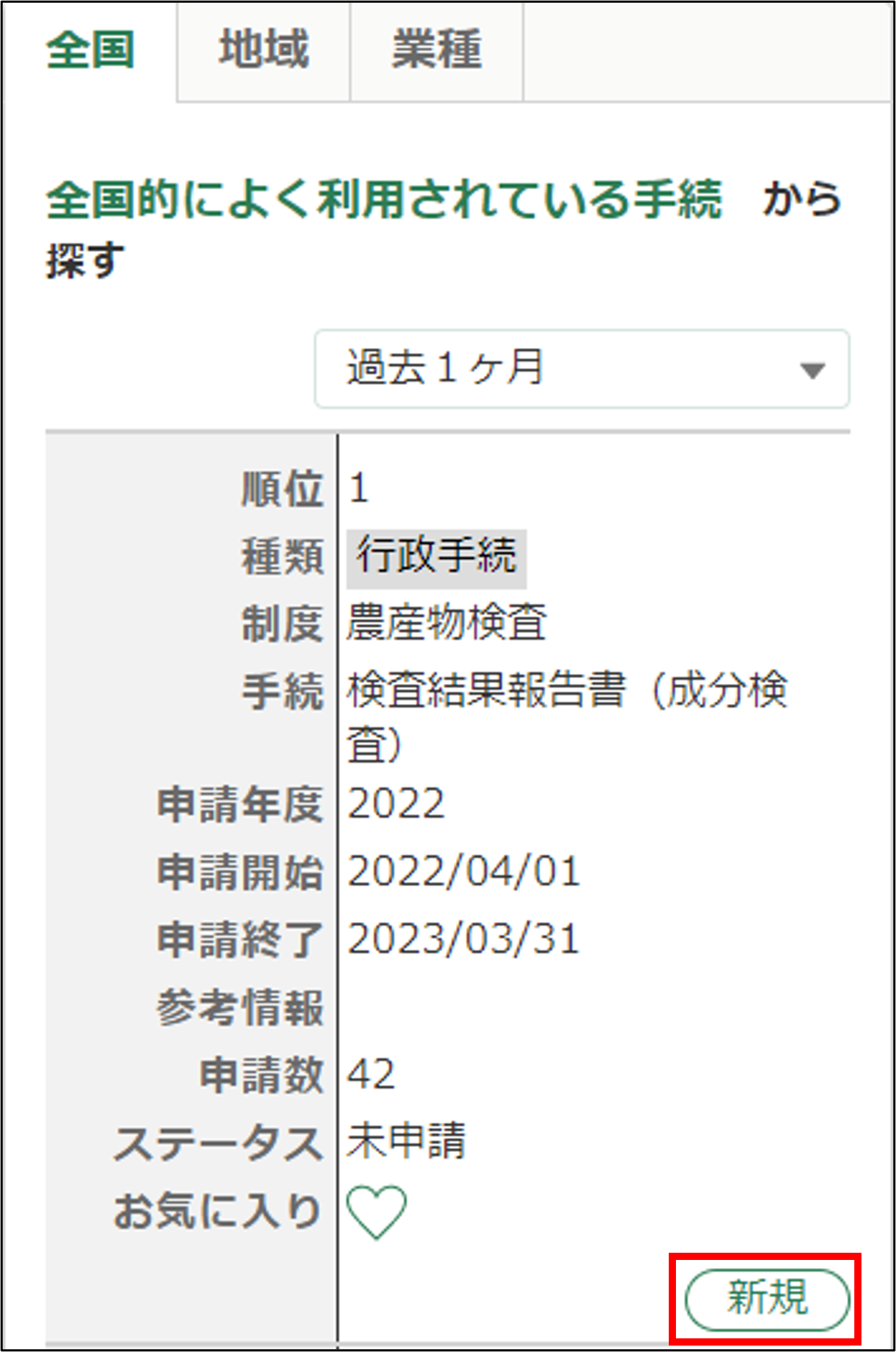 | ② | 地域タブ | 経営体の住所情報(市区町村)を元に、その地域でよく利用されている手続を表示します。 ※申請数が多い上位20件の手続を一覧に表示します。 |