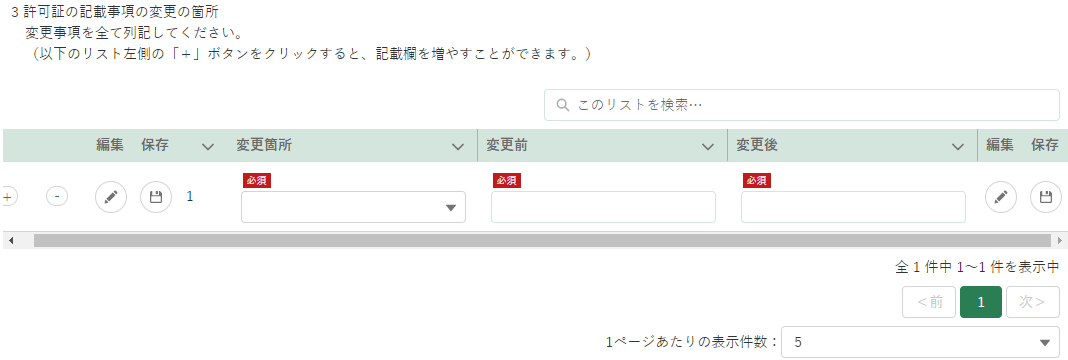 「3 許可証の記載事項の変更の箇所」を選択し、変更前後の内容を入力してください。