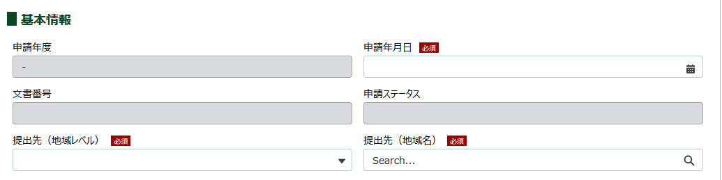「申請年月日」、「提出先(地域レベル)」、「提出先(地域名)」を入力します。