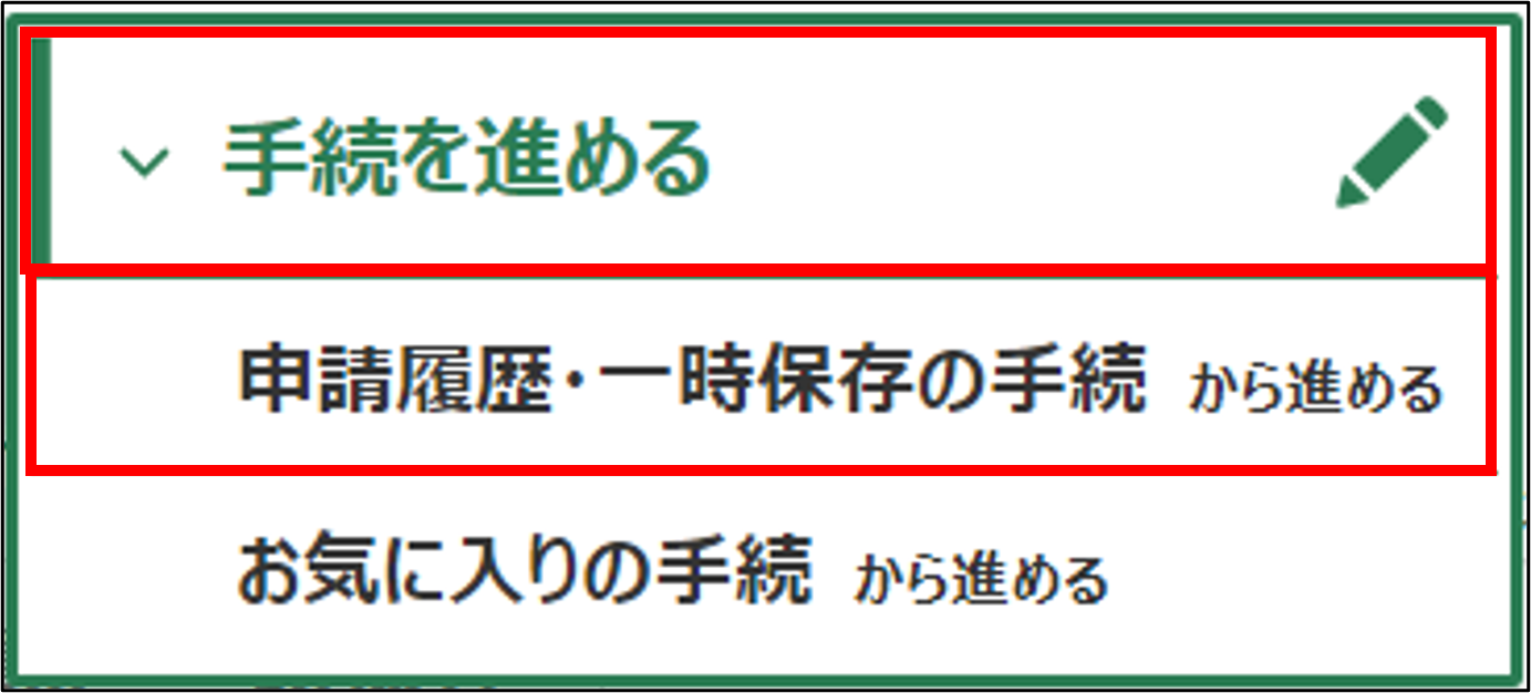 1.ホーム画面上部の「手続を進める」をクリックし、表示された一覧から「申請履歴・一時保存の手続から進める」をクリックします。