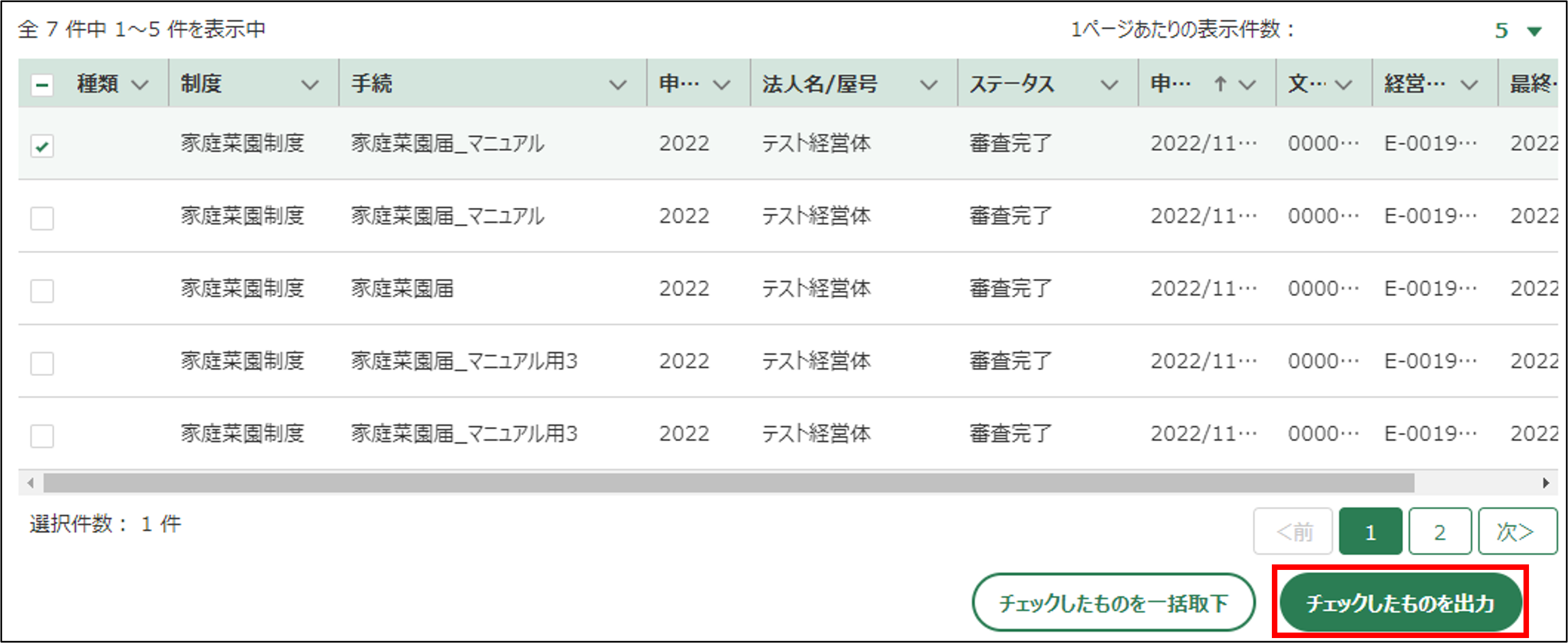 ページをまたいでチェックを入れることはできません。より多くの申請を出力する場合は、1ページ当たりの表示件数を増やしてください。