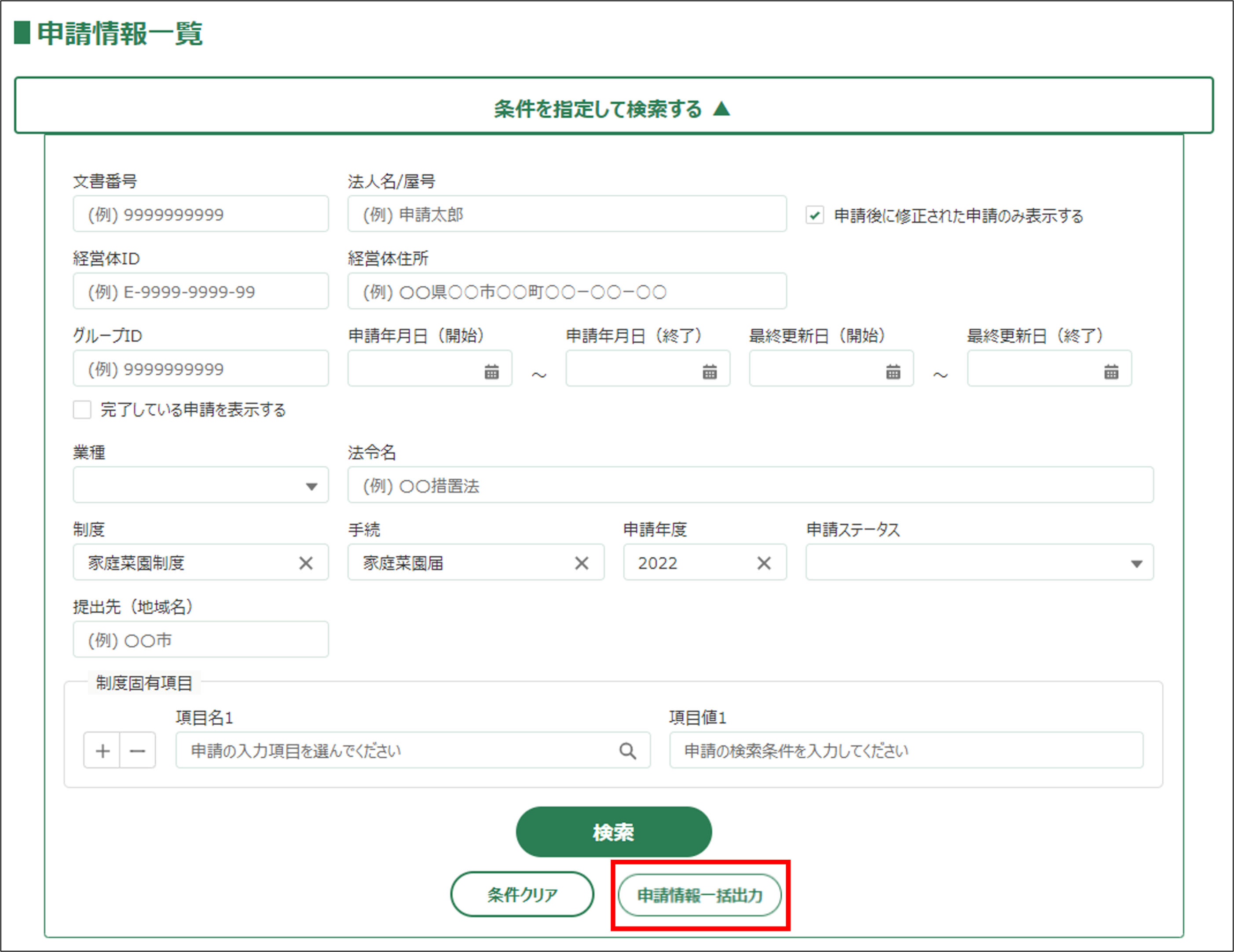 検索結果を確認のうえ、「申請情報一括出力」ボタンをクリックします。