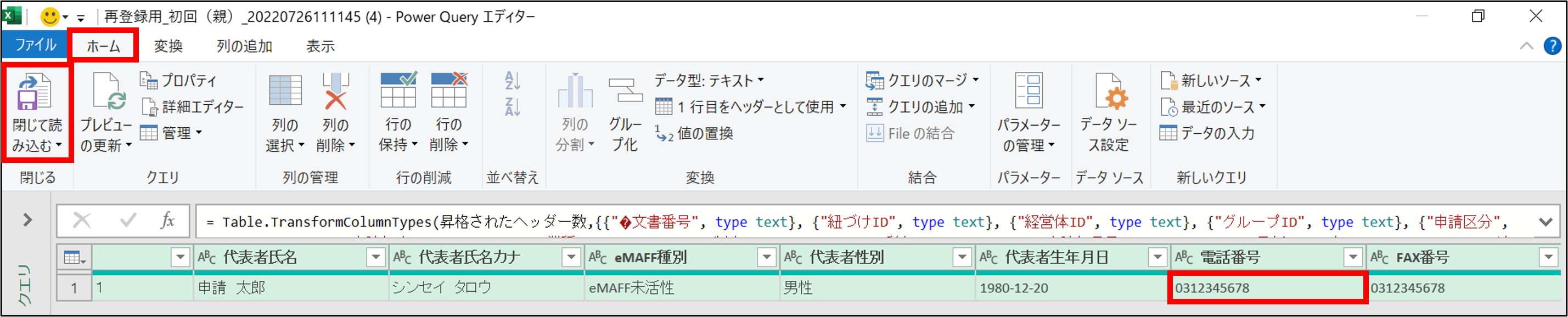 「ホーム」タブの「閉じて読み込む」をクリックします。