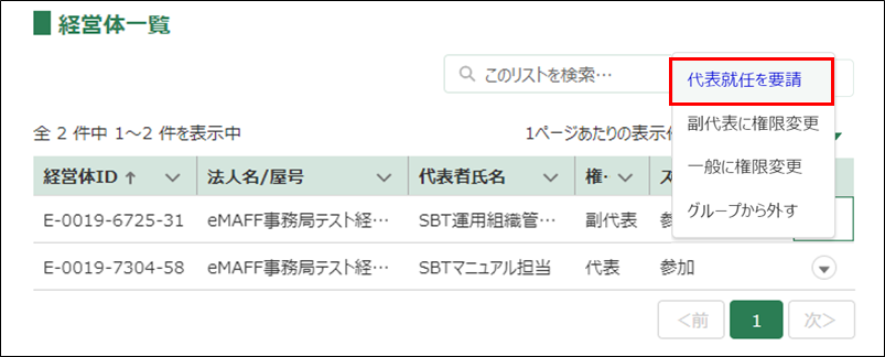 「経営体一覧」に表示されている経営体のうち、権限を変更したい経営体の「▼」ボタンをクリックし、「代表就任を要請」を選択します。