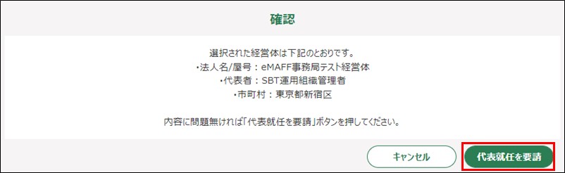 5.以下の確認メッセージが表示されます。内容を確認のうえ、「代表就任を要請」ボタンをクリックします。